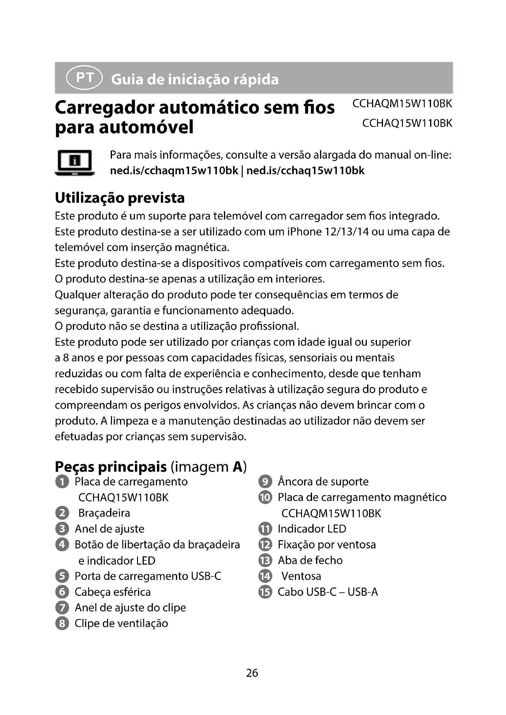 Para mais informações, consulte a versão alargada do manual on-line: ned.is/cchaqm15w110bk | ned.is/cchaq15w110bk Utilização prevista Este produto é um suporte para telemóvel com carregador sem os integrado. Este produto destina-se a ser utilizado com um iPhone 12/13/14 ou uma capa de telemóvel com inserção magnética. Este produto destina-se a dispositivos compatíveis com carregamento sem os. O produto destina-se apenas a utilização em interiores. Qualquer alteração do produto pode ter consequências em termos de segurança, garantia e funcionamento adequado. O produto não se destina a utilização prossional. Este produto pode ser utilizado por crianças com idade igual ou superior a 8 anos e por pessoas com capacidades físicas, sensoriais ou mentais reduzidas ou com falta de experiência e conhecimento, desde que tenham recebido supervisão ou instruções relativas à utilização segura do produto e compreendam os perigos envolvidos. As crianças não devem brincar com o produto. A limpeza e a manutenção destinadas ao utilizador não devem ser efetuadas por crianças sem supervisão. Peças principais (imagem A) 1 Placa de carregamento