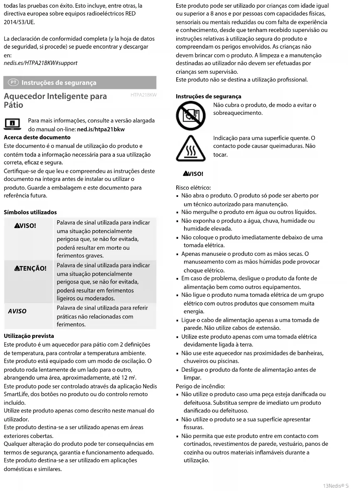 Instruções de segurança Aquecedor Inteligente para Pátio HTPA21BKW Para mais informações, consulte a versão alargada do manual on-line: ned.is/htpa21bkw Acerca deste documento Este documento é o manual de utilização do produto e contém toda a informação necessária para a sua utilização correta, ecaz e segura. Certique-se de que leu e compreendeu as instruções deste documento na íntegra antes de instalar ou utilizar o produto. Guarde a embalagem e este documento para referência futura. Símbolos utilizados AVISO! Palavra de sinal utilizada para indicar uma situação potencialmente perigosa que, se não for evitada, poderá resultar em morte ou ferimentos graves. ATENÇÃO! Palavra de sinal utilizada para indicar uma situação potencialmente perigosa que, se não for evitada, poderá resultar em ferimentos ligeiros ou moderados. AVISO Palavra de sinal utilizada para referir práticas não relacionadas com ferimentos. Utilização prevista Este produto é um aquecedor para pátio com 2 denições de temperatura, para controlar a temperatura ambiente. Este produto está equipado com um modo de oscilação. O produto roda lentamente de um lado para o outro, abrangendo uma área, aproximadamente, até 12 m