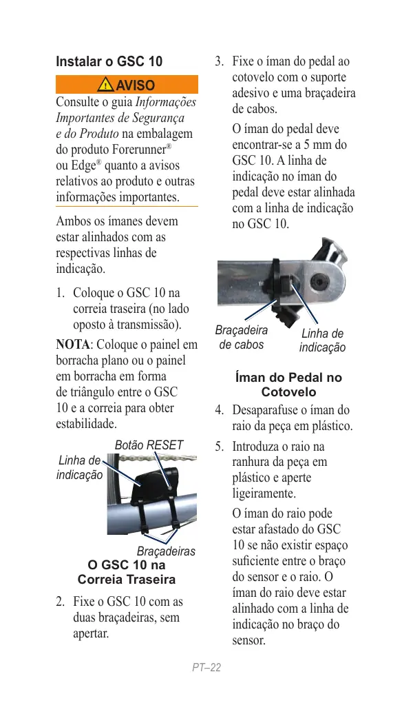 O LED vermelho apresenta-se intermitente sempre que o íman do pedal passa pelo sensor. O LED verde apresentase intermitente sempre que o íman do raio passa pelo braço do sensor. NOTA: Depois de reposto, o LED apresenta-se intermitente durante as primeiras 60 passagens. Prima Reset novamente se necessita de passagens adicionais. 10. Depois de realizado o alinhamento e confirmado o funcionamento de todos os componentes, aperte as braçadeiras dos cabos, o braço do sensor e o íman do raio. Emparelhar os sensores Emparelhar é ligar sensores sem fios ANT+™, por exemplo, o seu GSC 10 com um Edge. Após emparelhar pela primeira vez, o Edge reconhece automaticamente o seu GSC 10 sempre que o activar. NOTA: As definições de emparelhamento variam