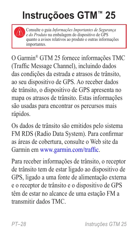O Garmin® GTM 25 fornece informações TMC (Traffic Message Channel), incluindo dados das condições da estrada e atrasos de trânsito, ao seu dispositivo de GPS. Ao receber dados de trânsito, o dispositivo de GPS apresenta no mapa os atrasos de trânsito. Estas informações são usadas para encontrar os percursos mais rápidos. Os dados de trânsito são emitidos pelo sistema FM RDS (Radio Data System). Para confirmar as áreas de cobertura, consulte o Web site da Garmin em www.garmin.com/traffic. Para receber informações de trânsito, o receptor de trânsito tem de estar ligado ao dispositivo de GPS, ligado a uma fonte de alimentação externa e o receptor de trânsito e o dispositivo de GPS têm de estar no alcance de uma estação FM a transmitir dados TMC. PT–28