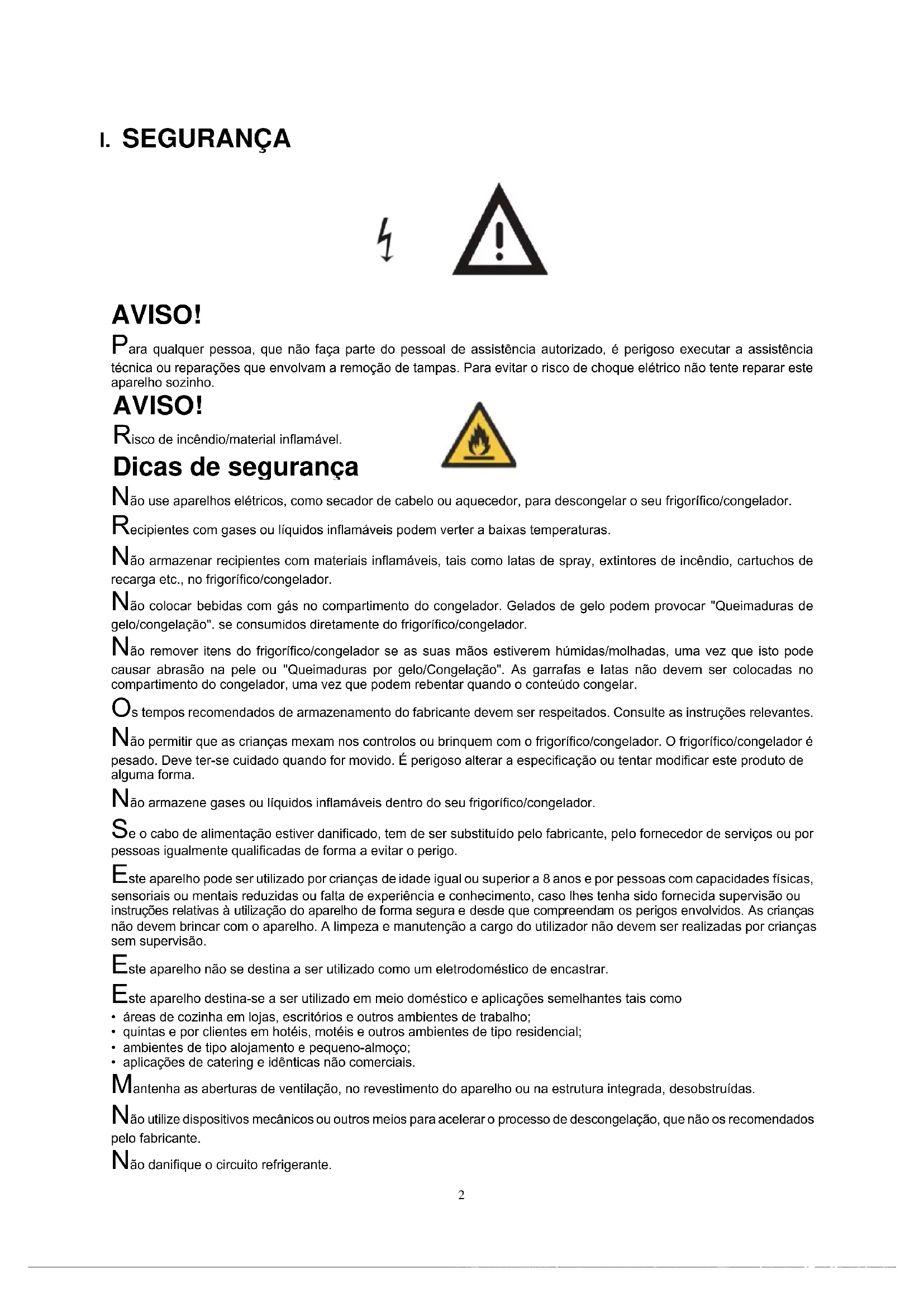 AVISO! Para qualquer pessoa, que não faça parte do pessoal de assistência autorizado, é perigoso executar a assistência técnica ou reparações que envolvam a remoção de tampas. Para evitar o risco de choque elétrico não tente reparar este aparelho sozinho. AVISO! Risco de incêndio/material inflamável. Dicas de segurança