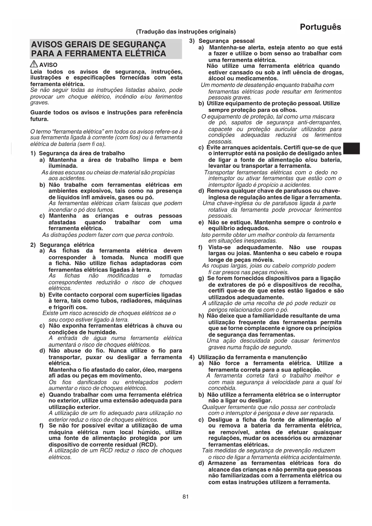 a) As fi chas da ferramenta elétrica devem corresponder à tomada. Nunca modifi que a fi cha. Não utilize fi chas adaptadoras com ferramentas elétricas ligadas à terra. As fi chas não modifi cadas e tomadas correspondentes reduzirão o risco de choques elétricos. b) Evite contacto corporal com superfícies ligadas à terra, tais como tubos, radiadores, máquinas e frigorífi cos. Existe um risco acrescido de choques elétricos se o seu corpo estiver ligado à terra. c) Não exponha ferramentas elétricas à chuva ou condições de humidade. A entrada de água numa ferramenta elétrica aumentará o risco de choques elétricos. d) Não abuse do fi o. Nunca utilize o fi o para transportar, puxar ou desligar a ferramenta elétrica. Mantenha o fi o afastado do calor, óleo, margens afi adas ou peças em movimento. Os fi os danifi cados ou entrelaçados podem aumentar o risco de choques elétricos. e) Quando trabalhar com uma ferramenta elétrica no exterior, utilize uma extensão adequada para utilização exterior. A utilização de um fi o adequado para utilização no exterior reduz o risco de choques elétricos. f) Se não for possível evitar a utilização de uma máquina elétrica num local húmido, utilize uma fonte de alimentação protegida por um dispositivo de corrente residual (RCD). A utilização de um RCD reduz o risco de choques elétricos. (Tradução das instruções originais) 00BookC3606DBEU.indb8100BookC3606DBEU.indb81 2022/10/0611:44:592022/10/0611:44:5982 Português As ferramentas elétricas são perigosas nas mãos de utilizadores inexperientes. e) Efetue a manutenção das ferramentas elétricas e acessórios. Verifi que a existência de desalinhamentos ou dobragens das peças móveis, quebras de peças e quaisquer outras condições que possam afetar o funcionamento da ferramenta elétrica. Se danifi cada, mande reparar a ferramenta antes de utilizar. Muitos acidentes são causados por ferramentas com má manutenção. f) Mantenha as ferramentas de corte afi adas e limpas. As ferramentas de corte com uma manutenção adequada e extremidades afi adas são menos propensas a dobrar e mais fáceis de controlar. g) Utilize a ferramenta elétrica, acessórios e brocas de ferramentas, etc., de acordo com estas instruções, tendo em consideração as condições de trabalho e o trabalho a ser efetuado. A utilização de uma ferramenta elétrica para operações diferentes das previstas pode resultar numa situação perigosa. h) Mantenha as pegas e as superfícies de manuseamento secas, limpas e livres de óleo e graxa. Pegas de manuseamento escorregadias não permitem a manipulação segura e controlo da ferramenta em situações inesperadas.