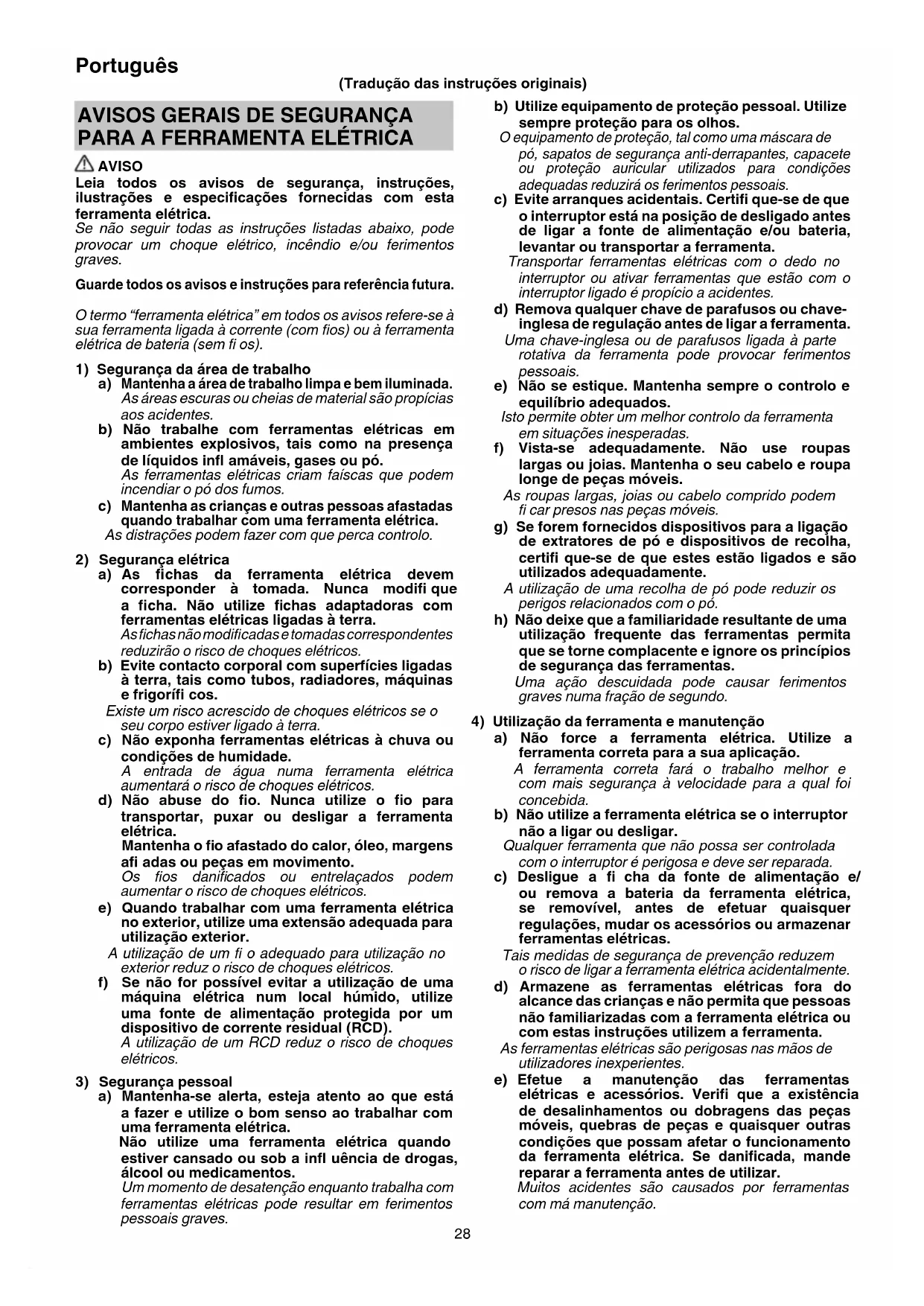 a) Mantenha-se alerta, esteja atento ao que está a fazer e utilize o bom senso ao trabalhar com uma ferramenta elétrica. Não utilize uma ferramenta elétrica quando estiver cansado ou sob a infl uência de drogas, álcool ou medicamentos. Um momento de desatenção enquanto trabalha com ferramentas elétricas pode resultar em ferimentos pessoais graves. (Tradução das instruções originais) 00BookDH26PB2.indb2800BookDH26PB2.indb28 2023/06/1513:36:032023/06/1513:36:0329 Português f) Mantenha as ferramentas de corte afi adas e limpas. As ferramentas de corte com uma manutenção adequada e extremidades afi adas são menos propensas a dobrar e mais fáceis de controlar. g) Utilize a ferramenta elétrica, acessórios e brocas de ferramentas, etc., de acordo com estas instruções, tendo em consideração as condições de trabalho e o trabalho a ser efetuado. A utilização de uma ferramenta elétrica para operações diferentes das previstas pode resultar numa situação perigosa. h) Mantenha as pegas e as superfícies de manuseamento secas, limpas e livres de óleo e graxa. Pegas de manuseamento escorregadias não permitem a manipulação segura e controlo da ferramenta em situações inesperadas.