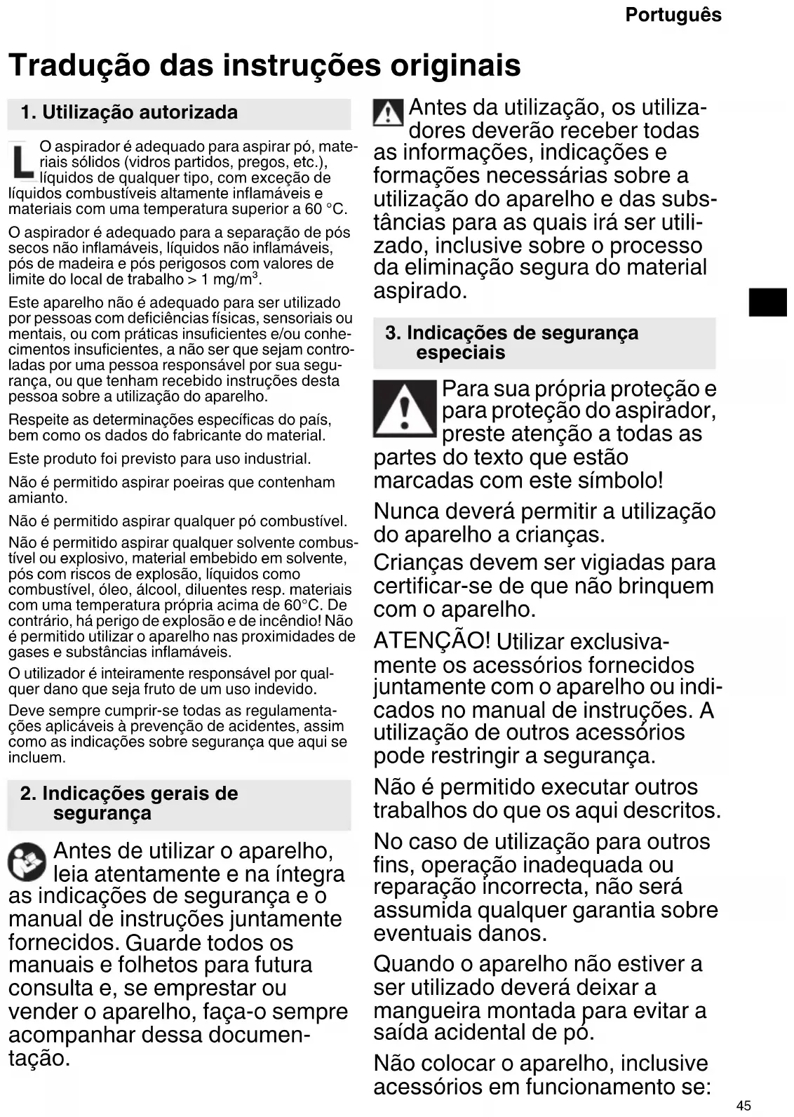 especiais RP250YBL_C99749871_305.book 45 ページ 2023年4月6日 木曜日 午後12時6分46 Português - o aparelho apresentar danos visí- veis (fissuras/quebras), - o cabo de conexão à rede estiver danificado ou apresentar sinais de fissuras resp. de envelheci- mentos, - houver suspeita de um defeito não visível (após uma queda). Não dirigir o bocal, a mangueira ou o tubo a pessoas ou animais. AVISO - Desligar imediata- mente quando sair espuma ou água. Esvaziar o reservatório e se necessário, o filtro de pregas. Nunca se sente ou suba para cima do aparelho. Instalar o cabo de ligação e a mangueira de modo que não haja risco de tropeços. Não puxar o cabo de ligação sobre bordos vivos, não dobrar ou entravar. Caso o cabo de ligação do aparelho esteja danificado deverá substituí-lo por um cabo de ligação especial. Veja capítulo Repara- ções. Ligar apenas a uma tomada com contacto de protecção. Não utilizar cabos adaptadores danificados. Jamais conectar ou puxar a ficha de rede com as mãos molhadas Puxar sempre apenas na ficha de rede, jamais no cabo. AVISO - A tomada no aparelho deve ser utilizada exclusivamente para os fins definidos no manual de instruções. Não deixar o aparelho sem vigi- lância. No caso de interrupção prolongada, deve sempre puxar a ficha da rede. O aspirador não pode ser utilizado ou armazenado no exterior em condições húmidas. IMPORTANTE - Este aparelho só deve ser armazenado no interior. Ácidos, acetonas e solventes podem ser quimicamente agres- sivos para os componentes do aparelho. Antes de qualquer manu- tenção, limpeza do aparelho e após cada utilização deverá desligar o aparelho e puxar a ficha de rede. Não devem ser utilizados apare- lhos de limpeza a vapor e apare- lhos de limpeza de alta pressão para limpar o aspirador. A parte interior da tampa sempre deve permanecer seca. Germinação devido a falta de limpeza a longo prazo, particular- mente na utilização em instalações de processamento de alimentos: Limpe e desinfete sempre o aspi- rador imediatamente após a utili- zação. Nunca deverá abrir o aparelho ao ar livre com chuva ou durante trovoadas. Em caso de temperaturas baixas, não utilizar o aparelho ao ar livre. Proibido utilizar o equipamento em recintos com riscos de explosão. Certifique-se de que o aspirador está estável. RP250YBL_C99749871_305.book 46 ページ 2023年4月6日 木曜日 午後12時6分47 Português No recinto deve haver uma quota de troca de ar L suficiente para o caso em que o ar de exaustão voltar ao interior do recinto. Observe as normas nacionais. Manter a tomada do aparelho seca e não a expor a humidade. Não coloque cabos de extensão entre o aspirador e a ferramenta elétrica. Quando utilizar a tomada da ferra- menta, utilize o aspirador num ambiente seco. AVISO! Este aparelho contém pó nocivo para a saúde. Processos de esvaziamento e de manutenção inclusive a elimi- nação do colector de pó, devem ser efectuados exclusivamente por técnicos, e que usam os correspondentes equipamentos de protecção. AVISO diante de perigo geral! ATENÇÃO! Não deverá utilizar o aparelho sem ter lido o manual de instruções! AVISO - Os técnicos operacionais devem receber instruções adequadas para a utilização deste aspirador e dos materiais para os quais é utilizado. Notas de segurança especiais Sinal de aviso para aparelhos com classe de pó L: O aparelho é adequado para a aspiração de substâncias ligeira- mente nocivas para a saúde. O aparelho não é adequado para a redução de pó de madeira no ar respirado. Os pós de diversos materiais como revestimentos que contenham chumbo, alguns tipos de madeira, minerais e metais, podem ser nocivos à saúde. O contacto ou a inalação de pós pode causar reacções alérgicas e/ ou doenças das vias respiratórias ao operador ou a pessoas a se encontrar nas proximidades. Determinados pós como de carvalho ou faia, são cancerígenos, principalmente quando em contacto com substâncias adicionais para tratamento da madeira (cromato, substâncias para tratamento da madeira).