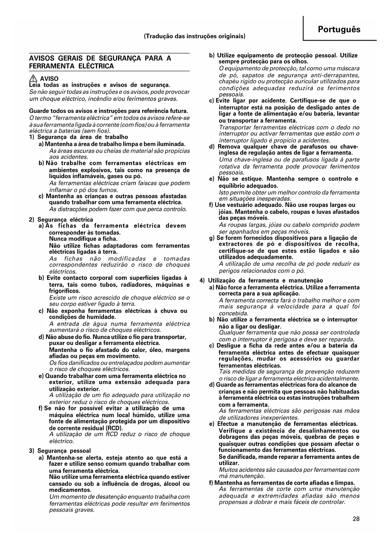 AVISO Leia todas as instruções e avisos de segurança. Se não seguir todas as instruções e os avisos, pode provocar um choque eléctrico, incêndio e/ou ferimentos graves. Guarde todos os avisos e instruções para referência futura. O termo “ferramenta eléctrica” em todos os avisos refere-se à sua ferramenta ligada à corrente (com fios) ou à ferramenta eléctrica a baterias (sem fios).