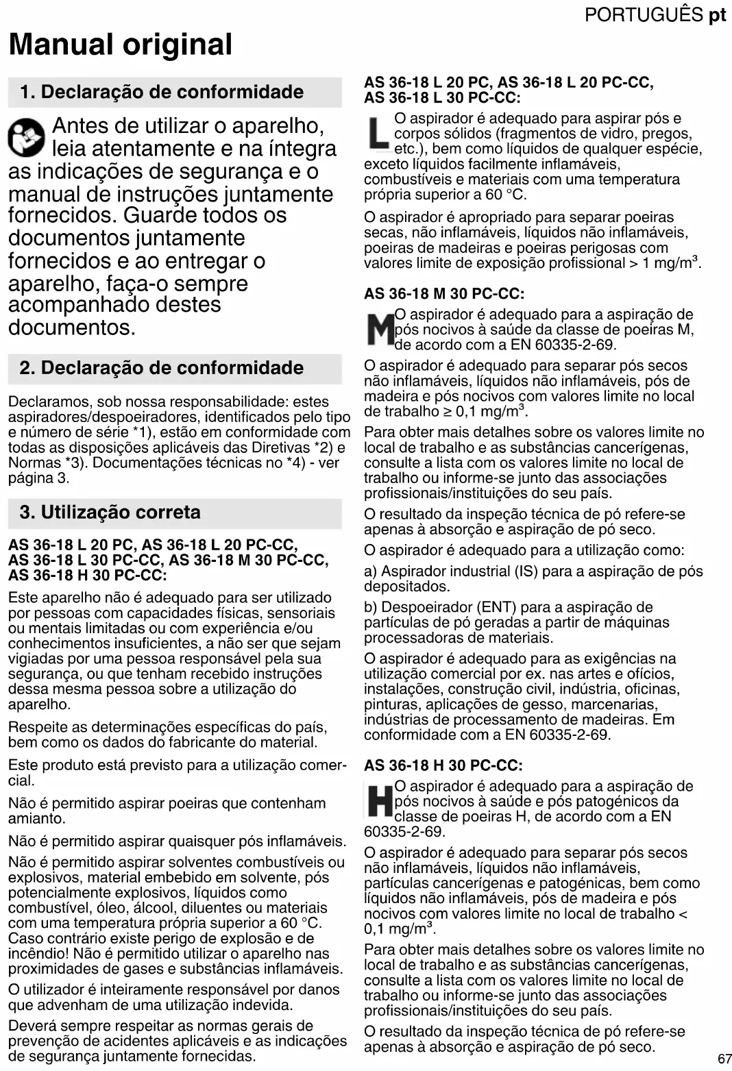 Manual original Antes de utilizar o aparelho, leia atentamente e na íntegra as indicações de segurança e o manual de instruções juntamente fornecidos. Guarde todos os documentos juntamente fornecidos e ao entregar o aparelho, faça-o sempre acompanhado destes documentos. Declaramos, sob nossa responsabilidade: estes aspiradores/despoeiradores, identificados pelo tipo e número de série *1), estão em conformidade com todas as disposições aplicáveis das Diretivas *2) e Normas *3). Documentações técnicas no *4) - ver página 3. AS 36-18 L 20 PC, AS 36-18 L 20 PC-CC, AS 36-18 L 30 PC-CC, AS 36-18 M 30 PC-CC, AS 36-18 H 30 PC-CC: Este aparelho não é adequado para ser utilizado por pessoas com capacidades físicas, sensoriais ou mentais limitadas ou com experiência e/ou conhecimentos insuficientes, a não ser que sejam vigiadas por uma pessoa responsável pela sua segurança, ou que tenham recebido instruções dessa mesma pessoa sobre a utilização do aparelho. Respeite as determinações específicas do país, bem como os dados do fabricante do material. Este produto está previsto para a utilização comer- cial. Não é permitido aspirar poeiras que contenham amianto. Não é permitido aspirar quaisquer pós inflamáveis. Não é permitido aspirar solventes combustíveis ou explosivos, material embebido em solvente, pós potencialmente explosivos, líquidos como combustível, óleo, álcool, diluentes ou materiais com uma temperatura própria superior a 60 °C. Caso contrário existe perigo de explosão e de incêndio! Não é permitido utilizar o aparelho nas proximidades de gases e substâncias inflamáveis. O utilizador é inteiramente responsável por danos que advenham de uma utilização indevida. Deverá sempre respeitar as normas gerais de prevenção de acidentes aplicáveis e as indicações de segurança juntamente fornecidas. AS 36-18 L 20 PC, AS 36-18 L 20 PC-CC, AS 36-18 L 30 PC-CC: O aspirador é adequado para aspirar pós e corpos sólidos (fragmentos de vidro, pregos, etc.), bem como líquidos de qualquer espécie, exceto líquidos facilmente inflamáveis, combustíveis e materiais com uma temperatura própria superior a 60 °C. O aspirador é apropriado para separar poeiras secas, não inflamáveis, líquidos não inflamáveis, poeiras de madeiras e poeiras perigosas com valores limite de exposição profissional > 1 mg/m³. AS 36-18 M 30 PC-CC: O aspirador é adequado para a aspiração de pós nocivos à saúde da classe de poeiras M, de acordo com a EN 60335-2-69. O aspirador é adequado para separar pós secos não inflamáveis, líquidos não inflamáveis, pós de madeira e pós nocivos com valores limite no local de trabalho ≥ 0,1 mg/m³. Para obter mais detalhes sobre os valores limite no local de trabalho e as substâncias cancerígenas, consulte a lista com os valores limite no local de trabalho ou informe-se junto das associações profissionais/instituições do seu país. O resultado da inspeção técnica de pó refere-se apenas à absorção e aspiração de pó seco. O aspirador é adequado para a utilização como: a) Aspirador industrial (IS) para a aspiração de pós depositados. b) Despoeirador (ENT) para a aspiração de partículas de pó geradas a partir de máquinas processadoras de materiais. O aspirador é adequado para as exigências na utilização comercial por ex. nas artes e ofícios, instalações, construção civil, indústria, oficinas, pinturas, aplicações de gesso, marcenarias, indústrias de processamento de madeiras. Em conformidade com a EN 60335-2-69. AS 36-18 H 30 PC-CC: O aspirador é adequado para a aspiração de pós nocivos à saúde e pós patogénicos da classe de poeiras H, de acordo com a EN 60335-2-69. O aspirador é adequado para separar pós secos não inflamáveis, líquidos não inflamáveis, partículas cancerígenas e patogénicas, bem como líquidos não inflamáveis, pós de madeira e pós nocivos com valores limite no local de trabalho < 0,1 mg/m³. Para obter mais detalhes sobre os valores limite no local de trabalho e as substâncias cancerígenas, consulte a lista com os valores limite no local de trabalho ou informe-se junto das associações profissionais/instituições do seu país. O resultado da inspeção técnica de pó refere-se apenas à absorção e aspiração de pó seco.