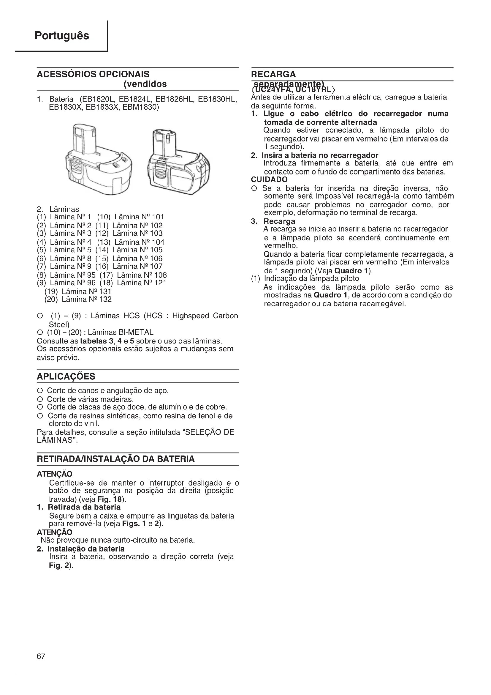 (1) Lâmina Nº 1 (10) Lâmina Nº 101 (2) Lâmina Nº 2 (11) Lâmina Nº 102 (3) Lâmina Nº 3 (12) Lâmina Nº 103 (4) Lâmina Nº 4 (13) Lâmina Nº 104 (5) Lâmina Nº 5 (14) Lâmina Nº 105 (6) Lâmina Nº 8 (15) Lâmina Nº 106 (7) Lâmina Nº 9 (16) Lâmina Nº 107 (8) Lâmina Nº 95 (17) Lâmina Nº 108 (9) Lâmina Nº 96 (18) Lâmina Nº 121 (19) Lâmina Nº 131 (20) Lâmina Nº 132 ○ (1) – (9) : Lâminas HCS (HCS : Highspeed Carbon Steel) ○ (10) – (20) : Lâminas Bl-METAL Consulte as tabelas 3, 4 e 5 sobre o uso das lâminas. Os acessórios opcionais estão sujeitos a mudanças sem aviso prévio. APLICAÇÕES ○ Corte de canos e angulação de aço. ○ Corte de várias madeiras. ○ Corte de placas de aço doce, de alumínio e de cobre. ○ Corte de resinas sintéticas, como resina de fenol e de cloreto de vinil. Para detalhes, consulte a seção intitulada “SELEÇÃO DE LÂMINAS”.