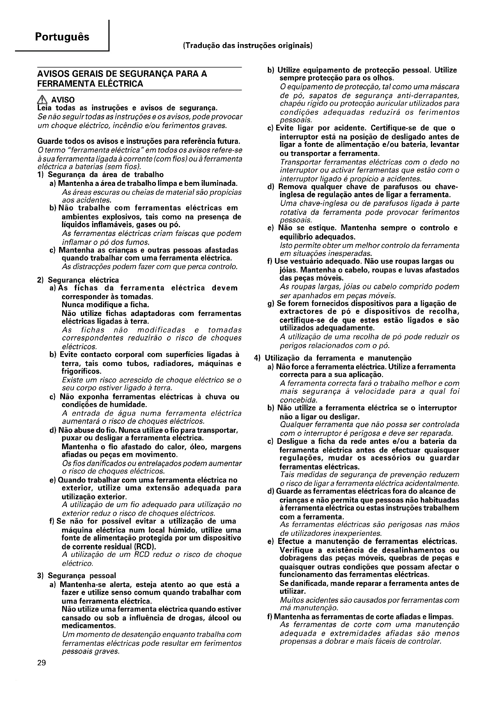 AVISO Leia todas as instruções e avisos de segurança. Se não seguir todas as instruções e os avisos, pode provocar um choque eléctrico, incêndio e/ou ferimentos graves. Guarde todos os avisos e instruções para referência futura. O termo “ferramenta eléctrica” em todos os avisos refere-se à sua ferramenta ligada à corrente (com fios) ou à ferramenta eléctrica a baterias (sem fios).