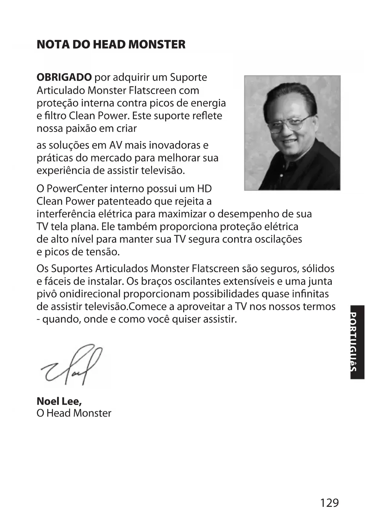 OBRIGADO por adquirir um Suporte Articulado Monster Flatscreen com proteção interna contra picos de energia e ltro Clean Power. Este suporte reete nossa paixão em criar as soluções em AV mais inovadoras e práticas do mercado para melhorar sua experiência de assistir televisão. O PowerCenter interno possui um HD Clean Power patenteado que rejeita a interferência elétrica para maximizar o desempenho de sua TV tela plana. Ele também proporciona proteção elétrica de alto nível para manter sua TV segura contra oscilações e picos de tensão. Os Suportes Articulados Monster Flatscreen são seguros, sólidos e fáceis de instalar. Os braços oscilantes extensíveis e uma junta pivô onidirecional proporcionam possibilidades quase innitas de assistir televisão.Comece a aproveitar a TV nos nossos termos - quando, onde e como você quiser assistir. Noel Lee, O Head MonsterPORTUGUêS