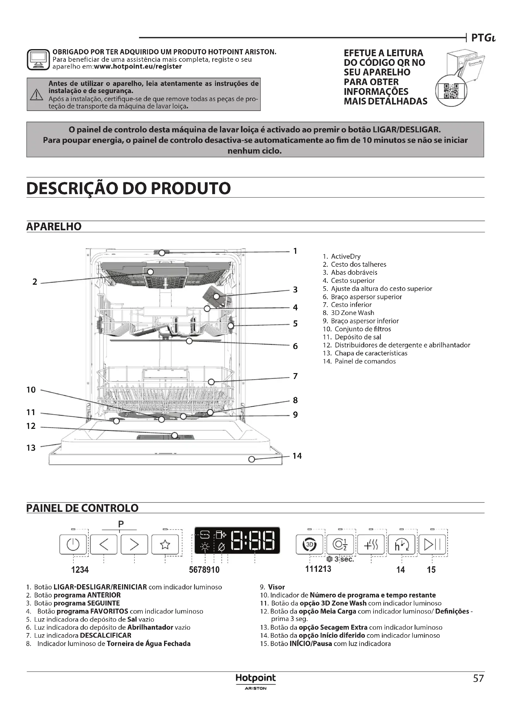 O painel de controlo desta máquina de lavar loiça é activado ao premir o botão LIGAR/DESLIGAR.Para poupar energia, o painel de controlo desactiva-se automaticamente ao m de 10 minutos se não se iniciar nenhum ciclo. APARELHO 1. ActiveDry2. Cesto dos talheres3. Abas dobráveis4. Cesto superior5. Ajuste da altura do cesto superior6. Braço aspersor superior7. Cesto inferior8. 3D Zone Wash9. Braço aspersor inferior10. Conjunto de ltros11. Depósito de sal12. Distribuidores de detergente eabrilhantador13. Chapa de características14. Painel de comandosOBRIGADO POR TER ADQUIRIDO UM PRODUTO HOTPOINT ARISTON. Para beneficiar de uma assistência mais completa, registe o seu aparelho em:www.hotpoint.eu/registerAntes de utilizar o aparelho, leia atentamente as instruções de instalação e de segurança.Após a instalação, certique-se de que remove todas as peças de pro-teção de transporte da máquina de lavar loiça. EFETUE ALEITURA