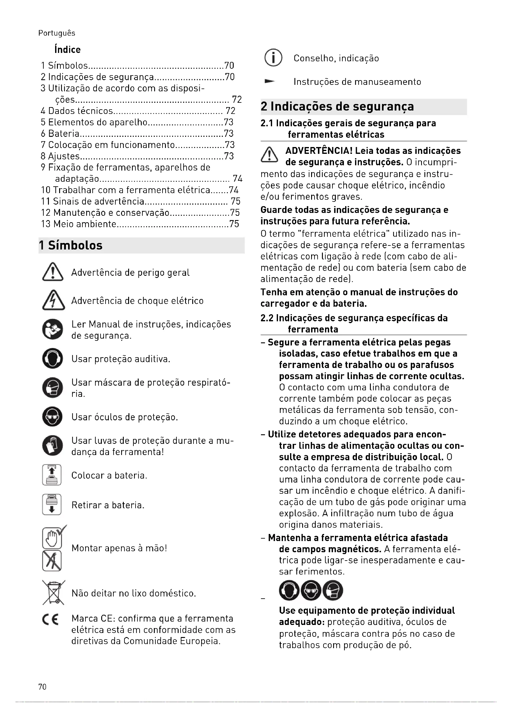 ferramentas elétricas ADVERTÊNCIA! Leia todas as indicações de segurança e instruções. O incumpri mento das indicações de segurança e instru ções pode causar choque elétrico, incêndio e/ou ferimentos graves. Guarde todas as indicações de segurança e instruções para futura referência. O termo "ferramenta elétrica" utilizado nas in dicações de segurança refere-se a ferramentas elétricas com ligação à rede (com cabo de ali mentação de rede) ou com bateria (sem cabo de alimentação de rede). Tenha em atenção o manual de instruções do carregador e da bateria.