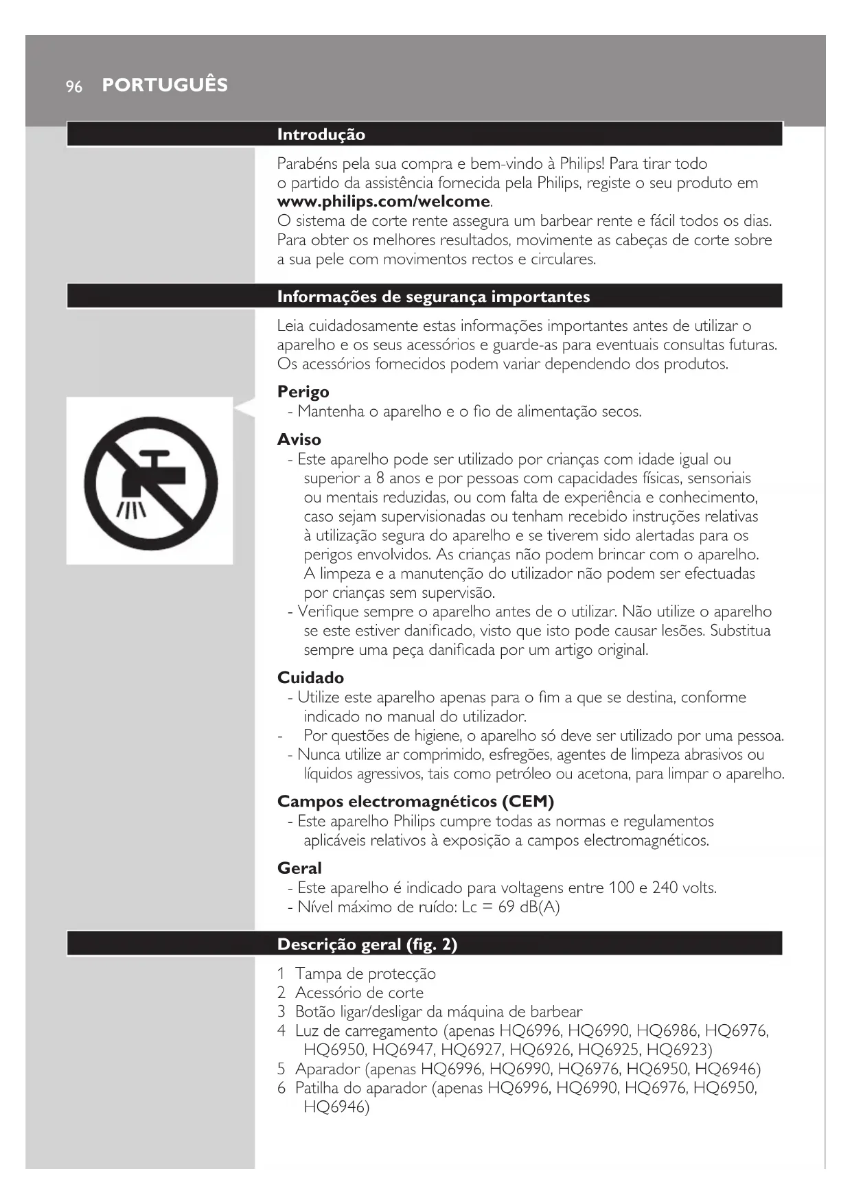 Por questões de higiene, o aparelho só deve ser utilizado por uma pessoa. - Nunca utilize ar comprimido, esfregões, agentes de limpeza abrasivos ou líquidos agressivos, tais como petróleo ou acetona, para limpar o aparelho. Campos electromagnéticos (CEM) - Este aparelho Philips cumpre todas as normas e regulamentos aplicáveis relativos à exposição a campos electromagnéticos. Geral - Este aparelho é indicado para voltagens entre 100 e 240 volts. - Nível máximo de ruído: Lc = 69 dB(A) Descrição geral (g. 2) 1 Tampa de protecção 2 Acessório de corte 3 Botão ligar/desligar da máquina de barbear 4 Luz de carregamento (apenas HQ6996, HQ6990, HQ6986, HQ6976, HQ6950, HQ6947, HQ6927, HQ6926, HQ6925, HQ6923) 5 Aparador (apenas HQ6996, HQ6990, HQ6976, HQ6950, HQ6946) 6 Patilha do aparador (apenas HQ6996, HQ6990, HQ6976, HQ6950, HQ6946) PORTUGUÊS7 Escova de limpeza 8 Cabo de alimentação com cha 9 Ficha do aparelho Carregamento Carregue o aparelho: - antes da primeira utilização e quando não o utiliza durante um período prolongado - quando o motor pára ou a sua velocidade é reduzida Ao carregar a máquina de barbear pela primeira vez e depois de não a usar durante um período prolongado, melhore a capacidade da bateria da seguinte forma: 1 Carregue totalmente a máquina de barbear e use-a como habitualmente até descarregar totalmente a bateria. Repita este processo mais duas vezes. Se melhorar a capacidade da bateria desta forma, também pode carregar a máquina de barbear entre períodos de utilização, mesmo que a bateria ainda não esteja totalmente descarregada. Carrega a máquina de barbear (apenas HQ6996, HQ6990, HQ6986, HQ6976, HQ6950, HQ6947, HQ6927, HQ6926, HQ6925, HQ6923) Carga rápida (apenas HQ6996, HQ6990, HQ6986) Depois da máquina de barbear ter sido carregada durante 3 minutos, esta contém energia suciente para se barbear uma vez com a máquina desligada da alimentação. Carregar com o adaptador 1 Introduzaachadoaparelhonamáquinadebarbear. 2 Introduzaachadealimentaçãonatomadaeléctrica. Nota: Certique-se de que a máquina está desligada. , A luz de carga acende-se. , HQ6996, HQ6990, HQ6986: Carregue a máquina de barbear durante, no mínimo, 1 hora, mas sem ultrapassar as 24 horas. Quando a bateria estiver totalmente carregada, a luz de carga ca intermitente. , HQ6976, HQ6950, HQ6947, HQ6927, HQ6926, HQ6925, HQ6923: Carregue a máquina de barbear durante, no mínimo, 8 horas, mas sem ultrapassar as 24 horas. A luz de carga permanece continuamente acesa enquanto o aparelho estiver ligado à corrente eléctrica. Nota: Não deixe a máquina de barbear ligada permanentemente à corrente. Nota: Pode igualmente barbear-se sem carregar, bastando para tal ligar a máquina de barbear à corrente. 3 Retireachadatomadaeléctricaeretireachadoaparelhoda máquina de barbear quando a bateria estiver totalmente carregada. PORTUGUÊS 97Utilizar o aparelho Apenas HQ6996, HQ6990, HQ6986, HQ6976, HQ6950, HQ6947, HQ6927, HQ6926, HQ6925, HQ6923: pode utilizar a máquina de barbear ligada directamente à corrente eléctrica, mas também a pode usar sem os. Apenas HQ6946, HQ6906, HQ6902: pode utilizar a máquina de barbear apenas directamente ligada à corrente eléctrica. Preparar para a utilização (apenas HQ6946, HQ6906, HQ6902) 1 Introduzaachadoaparelhonamáquinadebarbear. 2 Introduzaachadealimentaçãonatomadaeléctrica. Corte 1 Empurre o botão ligar/desligar para cima para ligar a máquina. 2 Passe as cabeças de corte sobre a pele, efectuando movimentos circulares. Obterá melhores resultados se a pele estiver seca. A sua pele poderá precisar de 2 a 3 semanas para se adaptar ao sistema de barbear Philips. 3 Empurre o botão de ligar/desligar para baixo de modo a desligar o aparelho. 4 Sempre que se servir da máquina de barbear coloque-lhe a tampa de protecção para evitar qualquer dano. Aparar (apenas HQ6996, HQ6990, HQ6976, HQ6950, HQ6946) Pode utilizar o aparador para aparar as patilhas e o bigode. 1 Desloque a patilha do aparador para cima para abrir o aparador. O aparador pode ser activado com o motor em funcionamento. Limpeza e manutenção Uma limpeza regular garante melhores resultados de barbear. Este aparelho não é lavável. Não o mergulhe em água nem o lave com água corrente. PORTUGUÊS98Nunca utilize esfregões, agentes de limpeza abrasivos ou líquidos agressivos, tais como petróleo ou acetona, para limpar o aparelho. - Para uma limpeza fácil e perfeita, encontra-se disponível o Produto de Limpeza de Cabeças de Corte Philips (tipo HQ110). Obtenha mais informações junto do seu revendedor Philips. Nota: O Produto de Limpeza de Cabeças de Corte Philips pode não estar disponível em todos os países. Contacte o Centro de Assistência ao Cliente do seu país para obter informações acerca da disponibilidade deste acessório. Também pode limpar a máquina de barbear da seguinte forma: Semanalmente: acessório de corte e câmara de recolha dos pêlos 1 Desligueamáquinadebarbear,retireachadealimentaçãoda tomadaeléctricaeretireachadoaparelhodamáquina. 2 Limpe primeiro a parte superior do aparelho com a escova fornecida. 3 Pressione o botão de libertação (1) e retire o acessório de corte (2). 4 Limpe o interior do acessório de corte e a câmara de recolha dos pêlos com a escova. 5 Volte a colocar o acessório de corte na máquina de barbear.