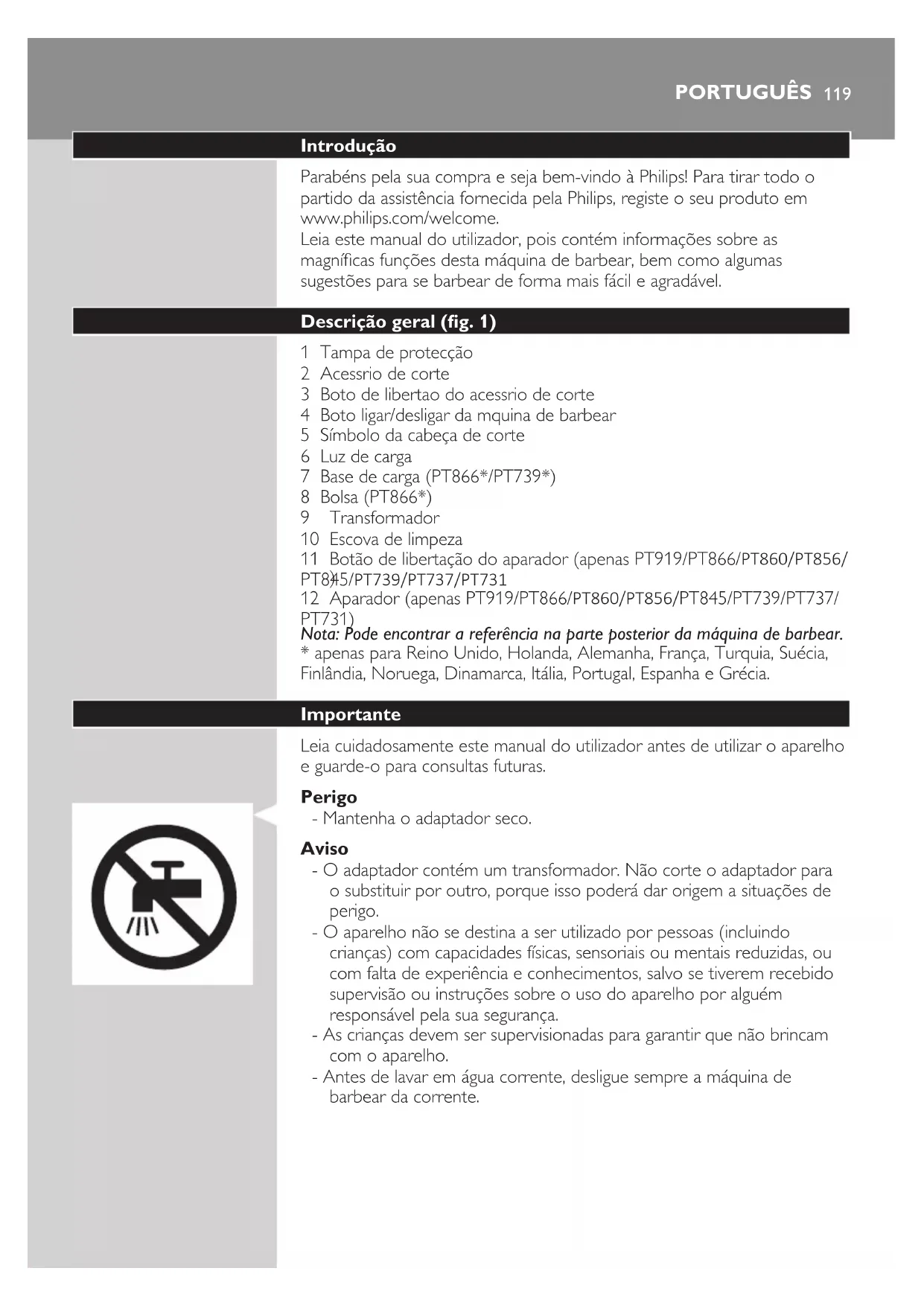 - apenas para Reino Unido, Holanda, Alemanha, França, Turquia, Suécia, Finlândia, Noruega, Dinamarca, Itália, Portugal, Espanha e Grécia. Importante Leia cuidadosamente este manual do utilizador antes de utilizar o aparelho e guarde-o para consultas futuras. Perigo - Mantenha o adaptador seco. Aviso - O adaptador contém um transformador. Não corte o adaptador para o substituir por outro, porque isso poderá dar origem a situações de perigo. - O aparelho não se destina a ser utilizado por pessoas (incluindo crianças) com capacidades físicas, sensoriais ou mentais reduzidas, ou com falta de experiência e conhecimentos, salvo se tiverem recebido supervisão ou instruções sobre o uso do aparelho por alguém responsável pela sua segurança. - As crianças devem ser supervisionadas para garantir que não brincam com o aparelho. - Antes de lavar em água corrente, desligue sempre a máquina de barbear da corrente. PORTUGUÊSCuidado - Nunca imerja a máquina de barbear em água. - Não utilize a máquina de barbear no banho ou no duche. - Não lave a máquina de barbear em água de temperatura superior a 80 °C. - Tenha cuidado com a água quente. Verique sempre se não está demasiado quente para evitar queimar as mãos. - A máquina de barbear não pode ser lavada na máquina de lavar loiça. - Pode pingar água da tomada na base da máquina de barbear ao enxaguá-la em água corrente. É normal e não é perigoso porque todos os componentes eléctricos estão protegidos numa unidade de alimentação selada no interior da máquina de barbear. - Não utilize a máquina de barbear, o transformador nem qualquer outra peça, caso estes estejam danicados, visto que isto pode causar ferimentos. Substitua sempre o transformador, o carregador ou uma peça por um equivalente de origem. - Utilize, carregue e guarde o aparelho a uma temperatura entre 10 °C e 35 °C. - Coloque e utilize sempre a máquina de barbear numa superfície impermeável. - Utilize apenas o adaptador, o carregador e os acessórios fornecidos. - Coloque sempre a tampa de protecção na máquina de barbear para evitar danos e a acumulação de sujidade nas cabeças de corte. Conformidade com as normas - Este aparelho Philips cumpre todas as normas e regulamentos relativos à exposição a campos electromagnéticos (CEM) e este pode ser limpo com água corrente de forma segura. Geral - O aparelho está equipado com um selector de voltagem automático e está preparado para voltagens entre 100 e 240 volts. - O adaptador transforma 100-240 volts numa tensão segura e baixa inferior a 24 volts. Carregamento PT919/PT866/PT860: demora aprox. 1 hora até carregar completamente a máquina de barbear. PT845/PT739/PT737/PT731/PT730//PT727/PT726/PT725/PT721/PT720: demora aprox. 8 horas até carregar completamente a máquina de barbear. Quando carregar a máquina de barbear pela primeira vez ou se não a utilizar por um longo período de tempo, deixe-a carregar até a luz de carga permanecer continuamente acesa. Uma máquina de barbear totalmente carregada fornece até 50 minutos (PT919/PT866/PT860) ou 45 minutos (PT845/PT739/PT737/PT731/ PT730//PT727/PT726/PT725/PT721/PT720) de autonomia. A duração da carga pode ser inferior a 50 minutos (PT919/PT866/PT860) ou 45 minutos de autonomia (PT845/PT739/PT737/PT731/PT730//PT727/ PT726/PT725/PT721/PT720) dependendo dos seus hábitos de barbear, das suas rotinas de higiene e do tipo de barba. PORTUGUÊS120Indicações de carga Bateria fraca - Quando a bateria está quase vazia (quando restam apenas 5 ou menos minutos de barbear), a luz de carga ca intermitente a cor de laranja. - Quando desligar a máquina de barbear, a luz de carga continua intermitente a cor de laranja durante alguns segundos. Carga rápida - Quando começa a carregar a bateria vazia, a luz de carga ca intermitente a cor de laranja e branco, alternadamente. Depois de aprox. 3 minutos, a luz de carga continua intermitente apenas a branco. A máquina de barbear contém agora energia suciente para uma sessão de barbear de 5 minutos. Carregamento - Quando a máquina de barbear está a carregar, a luz de carga ca intermitente a branco. Bateria completamente carregada - Quando a bateria estiver completamente carregada, a luz de carga acende continuamente a branco. Nota: Depois de aprox. 30 minutos, a luz de carga apaga-se para poupar energia. Carregar com o adaptador 1 Introduza a cha pequena na máquina de barbear. 2 Ligue o adaptador à tomada eléctrica. , A luz de carga indica o estado de carregamento da máquina de barbear (consulte a secção “Indicações de carga” neste capítulo). Carregamento na base de carga (apenas PT866/PT739) 1 Ligue a cha pequena à base de carga. 2 Ligue o adaptador à tomada eléctrica. 3 Coloque a máquina sobre a base de carga. , A luz de carga indica o estado de carregamento da máquina de barbear (consulte a secção “Indicações de carga” neste capítulo). PORTUGUÊS 121Utilização da máquina de barbear Nota: Também pode utilizar a máquina de barbear directamente a partir da corrente eléctrica. Basta ligar a máquina de barbear à corrente. Corte 1 Prima uma vez o botão ligar/desligar para ligar a máquina de barbear. 2 Passe as cabeças de corte sobre a pele, efectuando movimentos circulares. - A sua pele poderá precisar de 2 a 3 semanas para se adaptar ao sistema de barbear Philips. 3 Prima uma vez o botão de ligar/desligar para desligar a máquina de barbear. 4 Limpe a máquina de barbear (consulte o capítulo “Limpeza e manutenção”). Aparar (apenas PT919/PT866/PT860/PT856/PT845/PT739/PT737/ PT731) Pode utilizar o aparador para aparar as patilhas e o bigode. 1 Prima uma vez o botão ligar/desligar para ligar a máquina de barbear. 2 Empurre o comutador para baixo para abrir o aparador. , Pode agora utilizar o aparador. 3 Depois de aparar, feche o aparador e desligue a máquina de barbear. PORTUGUÊS122Limpeza e manutenção Nunca utilize ar comprimido, esfr