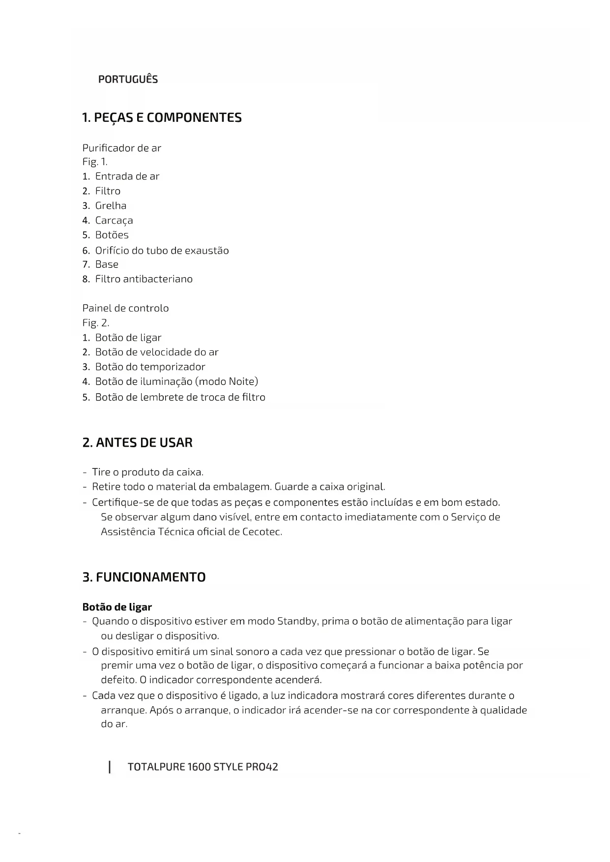 Encontre gratuitamente o manual do aparelho TotalPure 1600 Style CECOTEC em formato PDF.