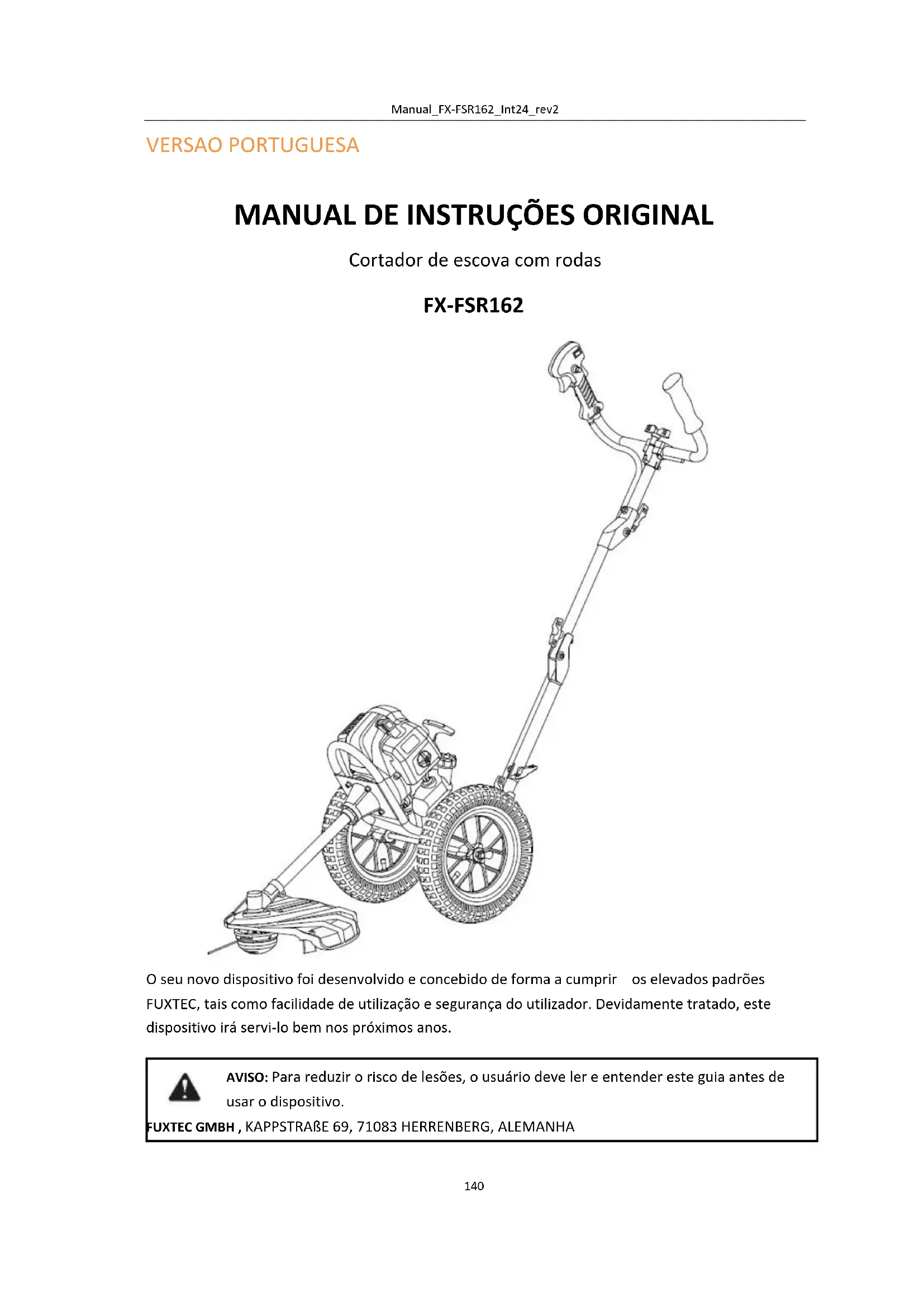 O seu novo dispositivo foi desenvolvido e concebido de forma a cumprir os elevados padrões FUXTEC, tais como facilidade de utilização e segurança do utilizador. Devidamente tratado, este dispositivo irá servi-lo bem nos próximos anos. AVISO: Para reduzir o risco de lesões, o usuário deve ler e entender este guia antes de usar o dispositivo. FUXTEC GMBH , KAPPSTRAßE 69, 71083 HERRENBERG, ALEMANHAManual_FX-FSR162_Int24_rev2