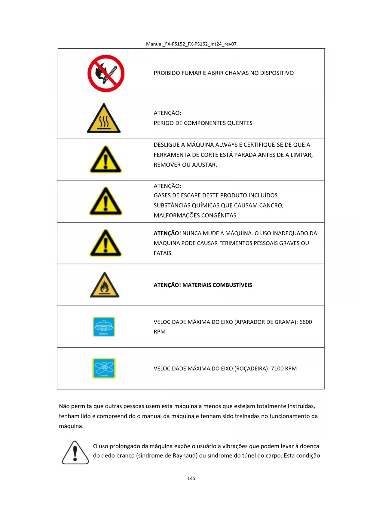 de segurança de pelo menos 15 metros da área de trabalho. ● Mantenha as mãos e os pés afastados da cabeça de corte de nylon ou da lâmina de metal durante o processo de trabalho. ● Não utilize a máquina se estiver cansado, doente ou sob a influência de medicação, drogas ou álcool. ● Use uma cabeça de corte de nylon intacta. Se você bater em uma pedra ou qualquer outro obstáculo, pare a máquina e verifique a cabeça de corte de nylon. Nunca deve ser utilizada uma cabeça de corte de nylon defeituosa ou desequilibrada. ● Antes de iniciar, após falha ou golpe, certifique-se de verificar o dispositivo e certifique-se de que está em boas condições. ● Atenção! Os regulamentos locais podem limitar o uso da máquina ● Mantenha sempre o dispositivo em boas condições com a ferramenta de corte. Tenha em atenção que uma manutenção inadequada, a utilização de peças sobresselentes não conformes ou a remoção ou modificação de dispositivos de segurança podem causar danos ao dispositivo e ferimentos graves à pessoa que trabalha com ele. ● Proteja bem o dispositivo durante o transporte para evitar perda de combustível, danos ao dispositivo e lesões. Instale sempre a proteção de transporte da lâmina de corte antes de transportar ou armazenar a máquina. ● Para máquinas com embraiagem, verifique regularmente se os acessórios de corte param de girar quando o motor está em marcha lenta sem carga. ● Antes de cada utilização, verifique a máquina quanto a fixadores soltos, fugas de combustível, peças danificadas, etc. Substitua as peças danificadas antes de utilizar. ● É necessário fazer pausas suficientes e mudar a posição de trabalho. ● Não guarde a máquina numa área fechada onde os vapores de combustível possam atingir uma fogueira a partir dos aquecedores de água quente, fornos, etc. Guarde a máquina numa área bem ventilada ● IMPORTANTE: Ao encher combustível, certifique-se de que a máquina está desligada e arrefecida. Nunca reabasteça quando a máquina estiver a funcionar ou a quente. Se a gasolina for derramada, limpe-a antes de ligar a máquinaManual_FX-PS152_FX-PS162_Int24_rev07