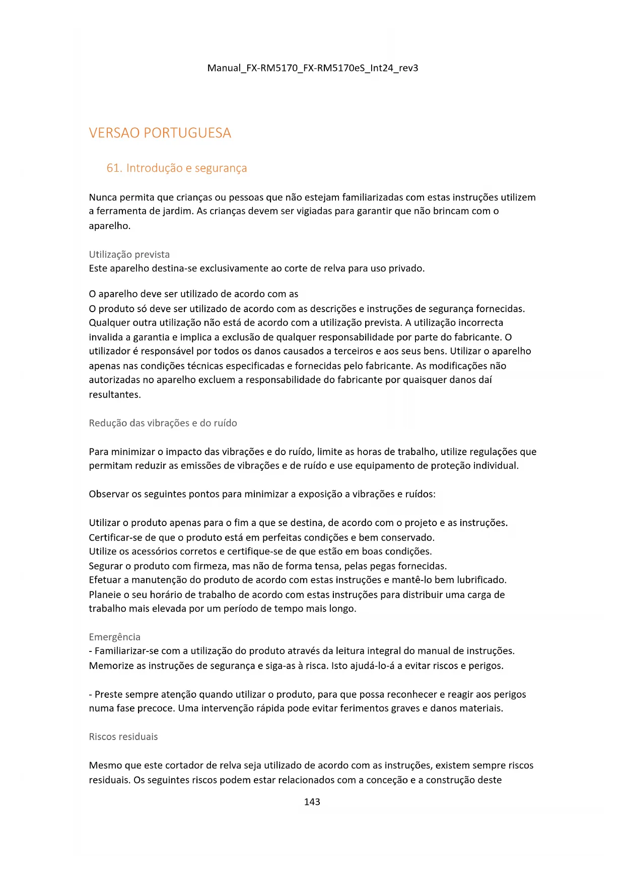 Nunca permita que crianças ou pessoas que não estejam familiarizadas com estas instruções utilizem a ferramenta de jardim. As crianças devem ser vigiadas para garantir que não brincam com o aparelho. Utilização prevista Este aparelho destina-se exclusivamente ao corte de relva para uso privado. O aparelho deve ser utilizado de acordo com as O produto só deve ser utilizado de acordo com as descrições e instruções de segurança fornecidas. Qualquer outra utilização não está de acordo com a utilização prevista. A utilização incorrecta invalida a garantia e implica a exclusão de qualquer responsabilidade por parte do fabricante. O utilizador é responsável por todos os danos causados a terceiros e aos seus bens. Utilizar o aparelho apenas nas condições técnicas especificadas e fornecidas pelo fabricante. As modificações não autorizadas no aparelho excluem a responsabilidade do fabricante por quaisquer danos daí resultantes. Redução das vibrações e do ruído Para minimizar o impacto das vibrações e do ruído, limite as horas de trabalho, utilize regulações que permitam reduzir as emissões de vibrações e de ruído e use equipamento de proteção individual. Observar os seguintes pontos para minimizar a exposição a vibrações e ruídos: Utilizar o produto apenas para o fim a que se destina, de acordo com o projeto e as instruções. Certificar-se de que o produto está em perfeitas condições e bem conservado. Utilize os acessórios corretos e certifique-se de que estão em boas condições. Segurar o produto com firmeza, mas não de forma tensa, pelas pegas fornecidas. Efetuar a manutenção do produto de acordo com estas instruções e mantê-lo bem lubrificado. Planeie o seu horário de trabalho de acordo com estas instruções para distribuir uma carga de trabalho mais elevada por um período de tempo mais longo. Emergência - Familiarizar-se com a utilização do produto através da leitura integral do manual de instruções. Memorize as instruções de segurança e siga-as à risca. Isto ajudá-lo-á a evitar riscos e perigos. - Preste sempre atenção quando utilizar o produto, para que possa reconhecer e reagir aos perigos numa fase precoce. Uma intervenção rápida pode evitar ferimentos graves e danos materiais. Riscos residuais Mesmo que este cortador de relva seja utilizado de acordo com as instruções, existem sempre riscos residuais. Os seguintes riscos podem estar relacionados com a conceção e a construção desteManual_FX-RM5170_FX-RM5170eS_Int24_rev3