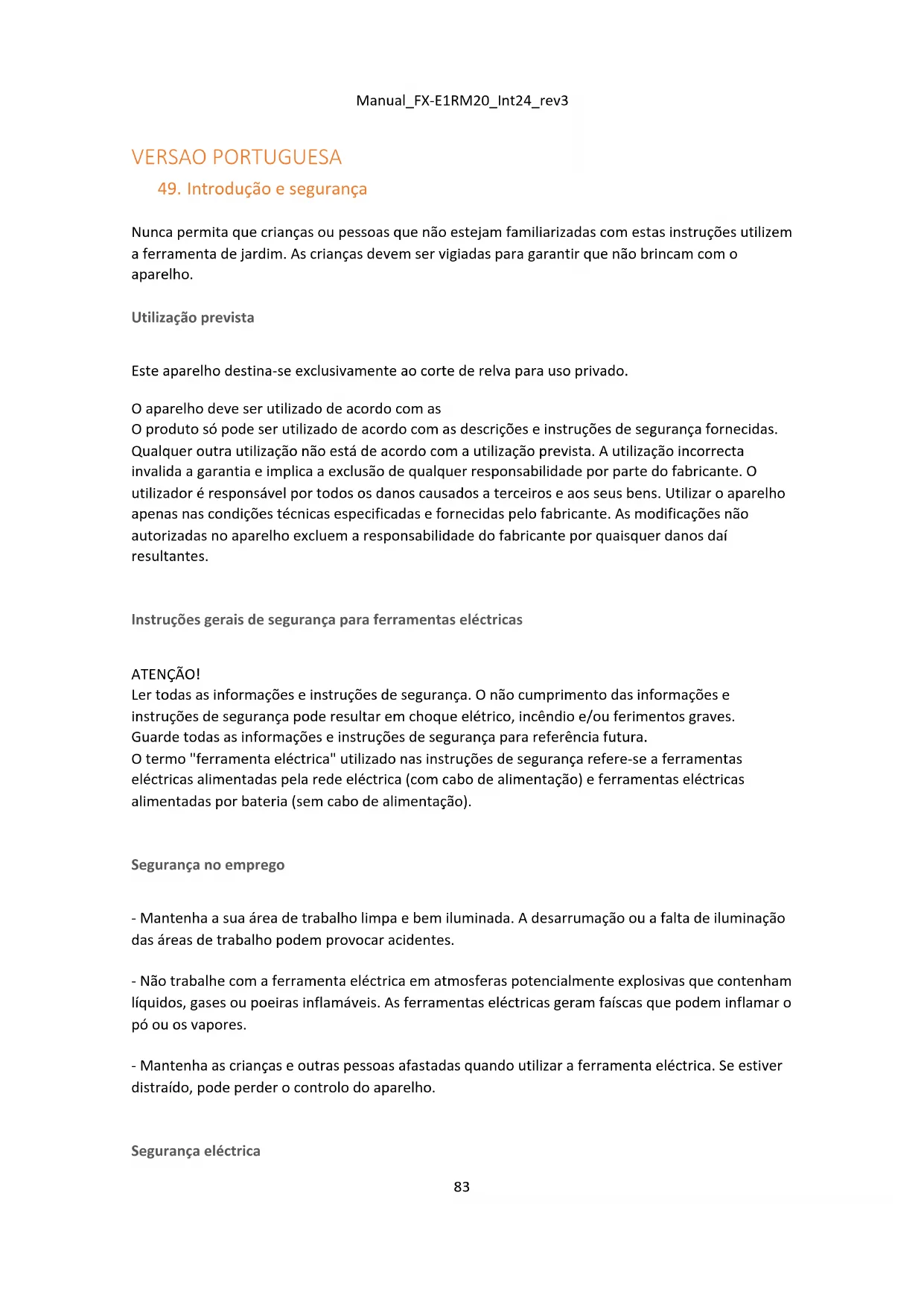 Quando utilizado Não ligue o aparelho se houver pessoas (especialmente crianças) ou animais nas imediações. Assegurar que as crianças não brincam com o aparelho. Interrompa o trabalho se verificar que há pessoas (especialmente crianças) ou animais de estimação nas proximidades. Trabalhar em declives acentuados pode ser perigoso. Certifique-se de que tem um pé firme e corte a relva lentamente. Corte sempre ao longo do declive e não para cima e para baixo. Tenha especial cuidado ao mudar de direção. Existe o risco de tombar! Não cortar a relva em declives acentuados. Tenha especial cuidado ao deslocar-se para trás durante o corte e ao puxar o cortador de relva na sua direção. Não inclinar o cortador de relva quando ligar o motor. Mantenha uma distância de segurança indicada pela estrutura da pega. Não ligue o motor até que os seus pés estejam a uma distância segura da barra de corte. Tenha cuidado e não coloque as mãos na barra de corte em rotação. Desligue o cortador de relva antes de o inclinar ou de o transportar, por exemplo, de/para o relvado ou sobre caminhos. Nunca conduza sobre gravilha com o motor em funcionamento. Existe o risco de ser atingido por pedras! Antes de levantar ou transportar o cortador de relva, desligar o motor, retirar a chave de segurança e esperar Até que a barra de corte esteja parada. Não regule a altura de corte enquanto o motor não estiver desligado e a barra de corte não estiver parada. Nunca abrir a tampa de descarga com o motor em funcionamento. Antes de retirar o dispositivo de recolha de relva, desligar o motor e esperar até que a barra de corte esteja parada. Depois de esvaziar o dispositivo de captação de relva, voltar a colocá- lo cuidadosamente e certificar-se de que o dispositivo de captação de relva está bem fixo ao cortador de relva. Se possível, não cortar a relva molhada. Não trabalhar com a ferramenta de jardim numManual_FX-E1RM20_Int24_rev3