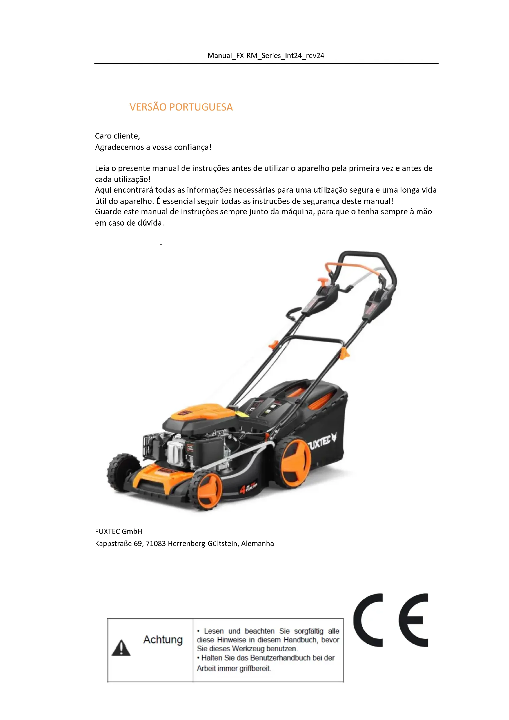 Instruções de segurança Não utilizar o aparelho num local fechado onde se possa acumular monóxido de carbono perigoso. Cortar a relva apenas à luz do dia ou sob boa luz artificial. Se possível, evitar utilizar o aparelho em condições de humidade. Certifique-se de que tem um pé firme nas encostas. Nunca correr com o aparelho, mas sim caminhar. Cortar sempre em declives com o dispositivo e não para cima e para baixo. Tenha especial cuidado ao mudar de direção. Não cortar a relva em declives demasiado acentuados. Tenha especial cuidado ao cortar a relva para trás ou na sua direção. Desligar o motor se o cortador de relva tiver de ser inclinado durante o transporte para o deslocar para outra área de corte. Nunca utilize o aparelho com escudos de proteção defeituosos ou sem dispositivos de proteção, por exemplo, calhas de ejeção deslizantes ou apanhadores de aparas. Não altere as definições do motor nem aumente a velocidade. Desengatar as lâminas e puxar ligeiramente o cabo de arranque antes de ligar o motor. Ligar ou arrancar o motor cuidadosamente de acordo com as instruções. Manter os pés afastados das lâminas. Não inclinar o cortador de relva durante o arranque do motor, exceto se for necessário inclinar o aparelho para o arranque. Neste caso, não inclinar o aparelho mais do que o necessário e levantar apenas a parte do aparelho que está afastada do utilizador.Manual_FX-RM_Series_Int24_rev24