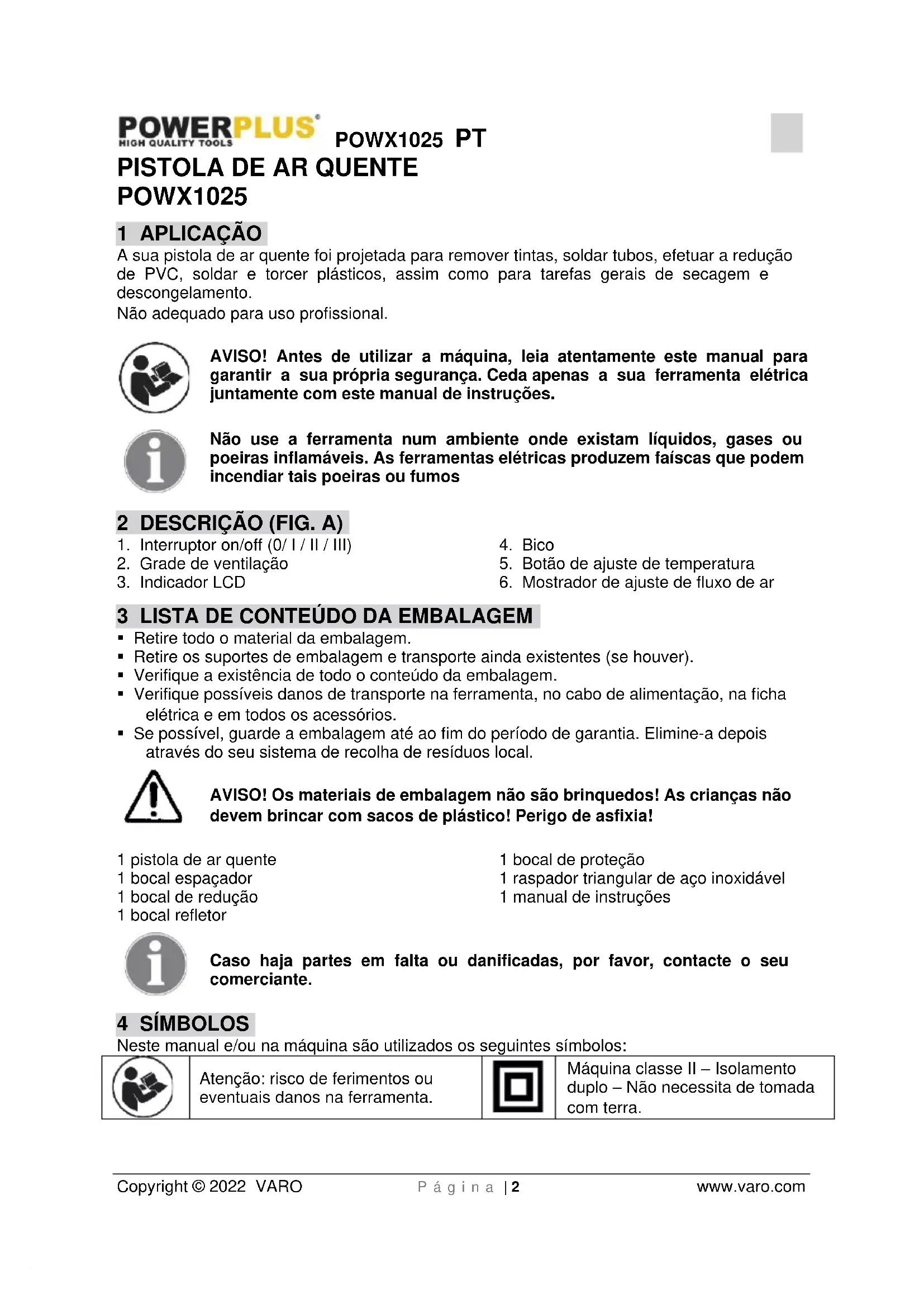 Máquina classe II – Isolamento duplo – Não necessita de tomada com terra.POWX1025 PT Copyright © 2022 VARO P á g i n a | 3 www.varo.com