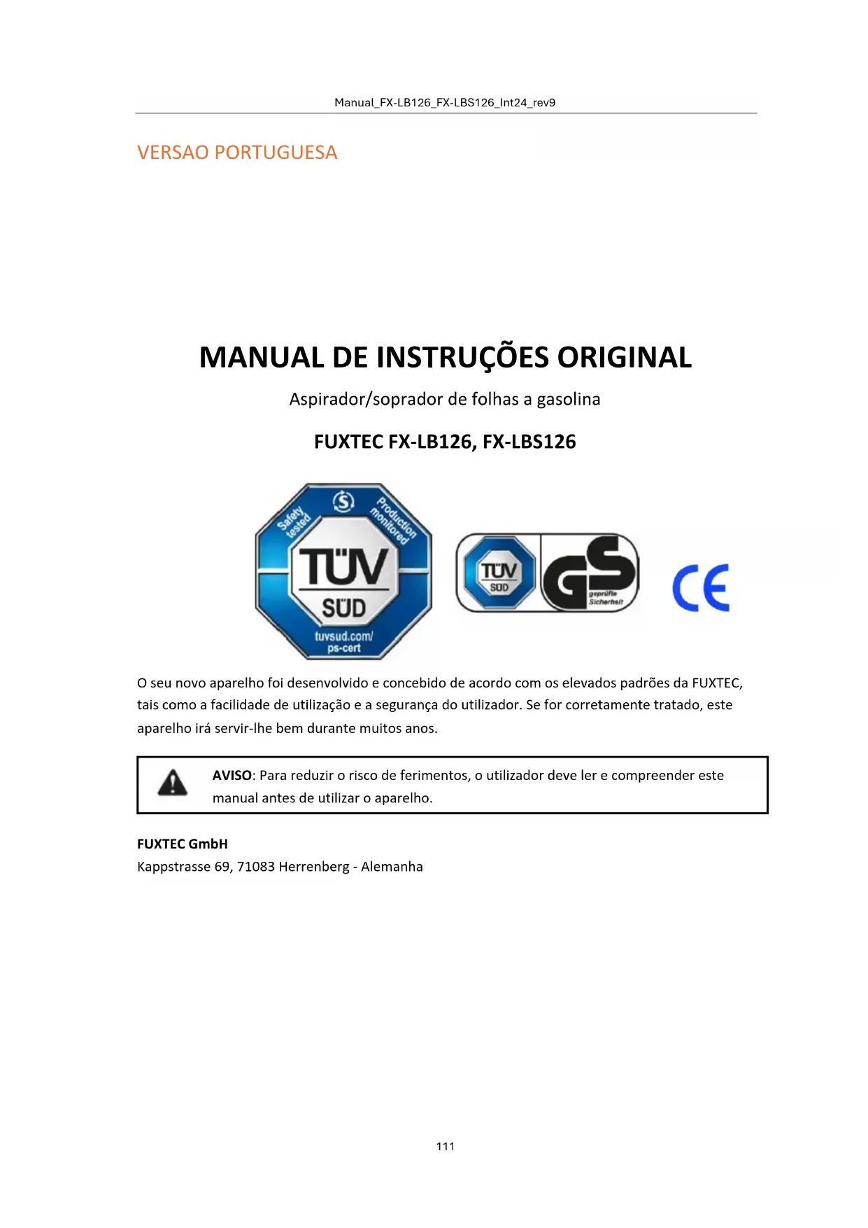 O seu novo aparelho foi desenvolvido e concebido de acordo com os elevados padrões da FUXTEC, tais como a facilidade de utilização e a segurança do utilizador. Se for corretamente tratado, este aparelho irá servir-lhe bem durante muitos anos. AVISO: Para reduzir o risco de ferimentos, o utilizador deve ler e compreender este manual antes de utilizar o aparelho. FUXTEC GmbH Kappstrasse 69, 71083 Herrenberg - AlemanhaManual_FX-LB126_FX-LBS126_Int24_rev9