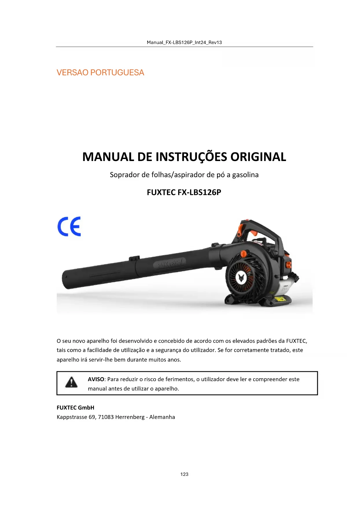 O seu novo aparelho foi desenvolvido e concebido de acordo com os elevados padrões da FUXTEC, tais como a facilidade de utilização e a segurança do utilizador. Se for corretamente tratado, este aparelho irá servir-lhe bem durante muitos anos. AVISO: Para reduzir o risco de ferimentos, o utilizador deve ler e compreender este manual antes de utilizar o aparelho. FUXTEC GmbH Kappstrasse 69, 71083 Herrenberg - AlemanhaManual_FX-LBS126P_Int24_Rev13