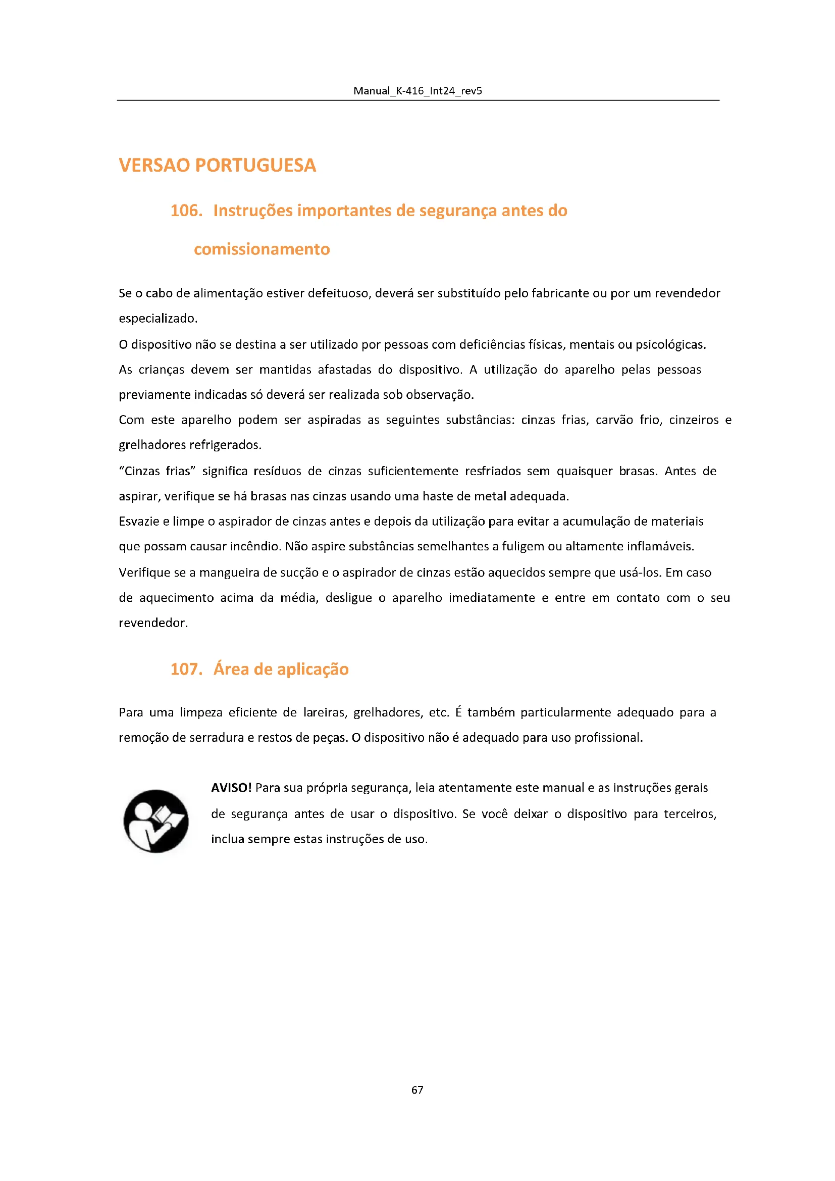 Para uma limpeza eficiente de lareiras, grelhadores, etc. É também particularmente adequado para a remoção de serradura e restos de peças. O dispositivo não é adequado para uso profissional. AVISO! Para sua própria segurança, leia atentamente este manual e as instruções gerais de segurança antes de usar o dispositivo. Se você deixar o dispositivo para terceiros, inclua sempre estas instruções de uso.Manual_K-416_Int24_rev5