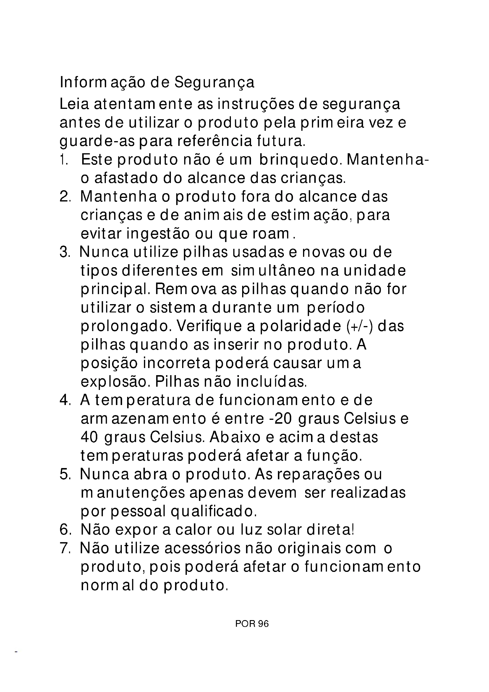 tipos diferentes em simultâneo na unidade principal. Remova as pilhas quando não for utilizar o sistema durante um período prolongado. Verifique a polaridade (+/-) das pilhas quando as inserir no produto. A posição incorreta poderá causar uma explosão. Pilhas não incluídas.