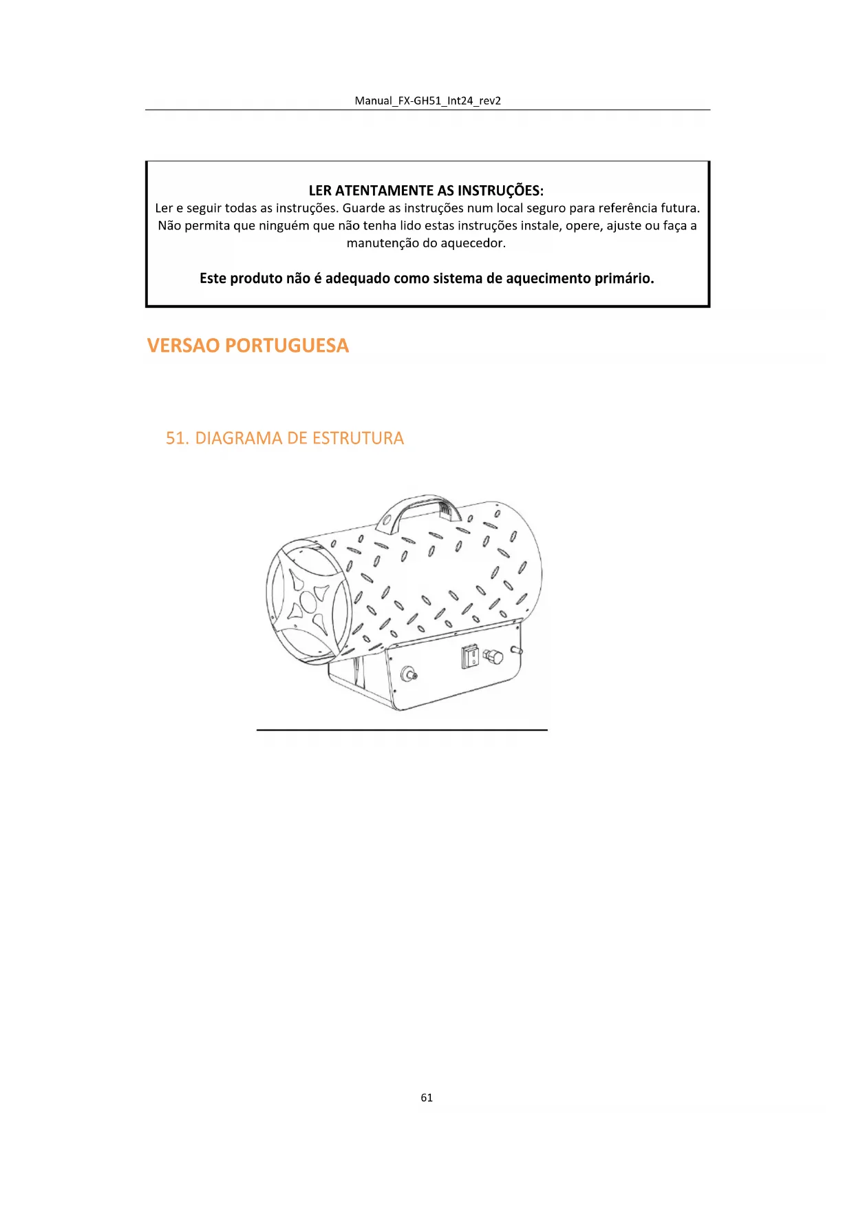 LER ATENTAMENTE AS INSTRUÇÕES: Ler e seguir todas as instruções. Guarde as instruções num local seguro para referência futura. Não permita que ninguém que não tenha lido estas instruções instale, opere, ajuste ou faça a manutenção do aquecedor. Este produto não é adequado como sistema de aquecimento primário.Manual_FX-GH51_Int24_rev2