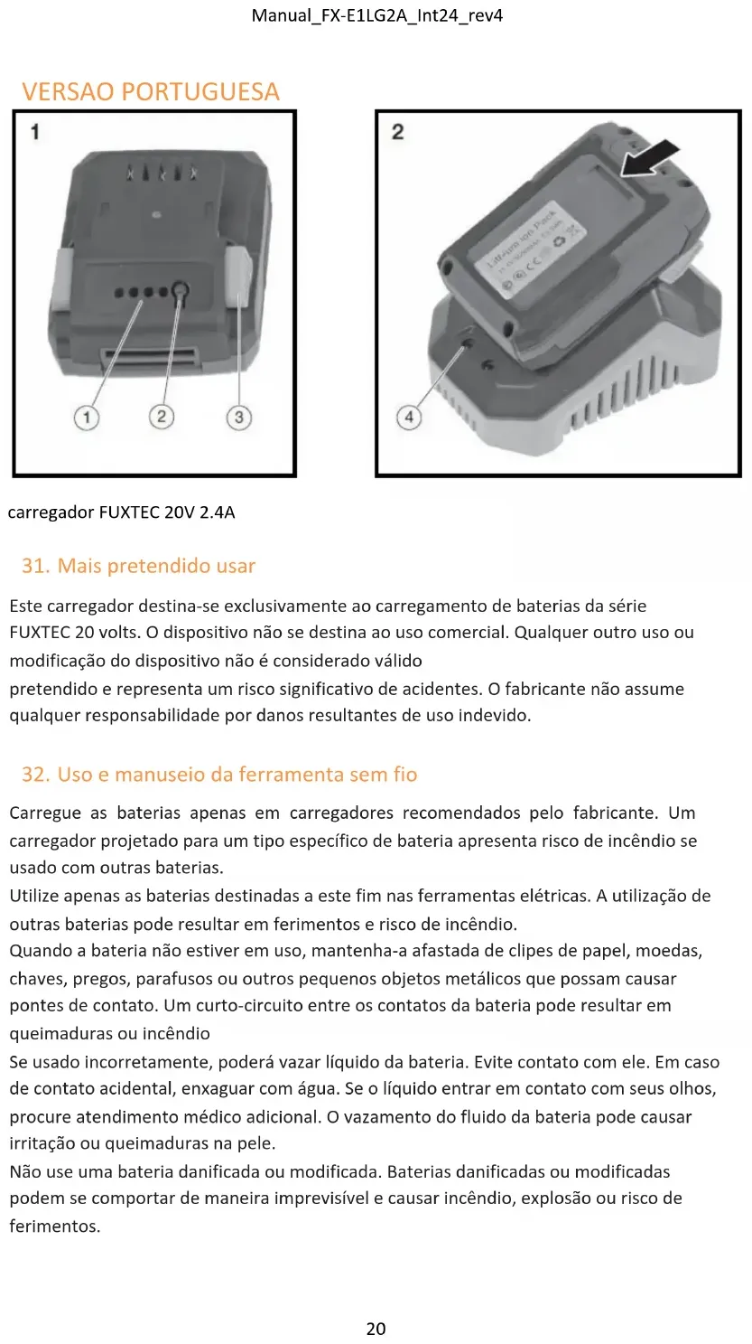 Este carregador destina-se exclusivamente ao carregamento de baterias da série FUXTEC 20 volts. O dispositivo não se destina ao uso comercial. Qualquer outro uso ou modificação do dispositivo não é considerado válido pretendido e representa um risco significativo de acidentes. O fabricante não assume qualquer responsabilidade por danos resultantes de uso indevido.