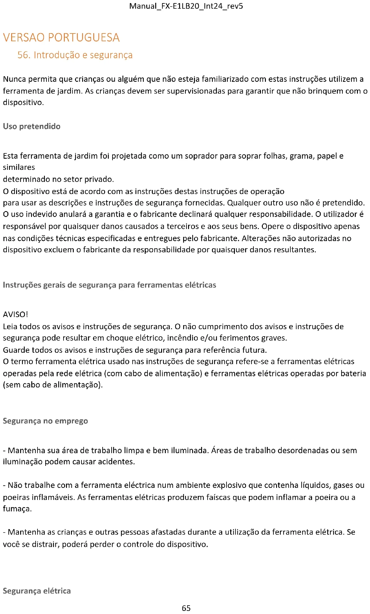 Instruções gerais de segurança - Para sua segurança e a segurança de outras pessoas, leia este manual de instruções e suas instruções de segurança antes de usar o dispositivo. Guarde as instruções de operação e mantenha suas instruções de segurança seguras para uso posterior cada uso disponível. - Transmitir o manual de instruções junto com o aparelho caso mude de proprietário. - As pessoas que operam o dispositivo não devem estar sob a influência de substâncias intoxicantes (por exemplo, álcool, drogas ou medicamentos). - Opere o dispositivo apenas da maneira prescrita e entregue pelo fabricante condição técnica. Alterações não autorizadas no dispositivo excluem o fabricante da responsabilidade por quaisquer danos resultantes. - Utilize o aparelho apenas à luz do dia ou sob boa iluminação artificial. - Utilize o aparelho apenas em condições de tempo seco. Mantenha-o longe da chuva ou molhado. Permitir a entrada de água no dispositivo aumenta o risco de choque elétrico. - Desligue o aparelho e remova a bateria nas seguintes condições: ⬧se o dispositivo for deixado sem vigilância; ⬧antes de verificar, limpar ou realizar qualquer outro trabalho no aparelho; ⬧se o dispositivo começar a vibrar excessivamente. Antes de usar - Antes de iniciar o trabalho, familiarize-se com o soprador e suas funções e controles. - Verifique se o dispositivo apresenta sinais de desgaste ou danos antes do uso e após um impacto. - Não utilize um dispositivo cujo interruptor esteja com defeito e não possa mais ser ligado ou desligado. - Verifique se todas as porcas e parafusos estão apertados para garantir que o dispositivo funcione com segurança.Manual_FX-E1LB20_Int24_rev5