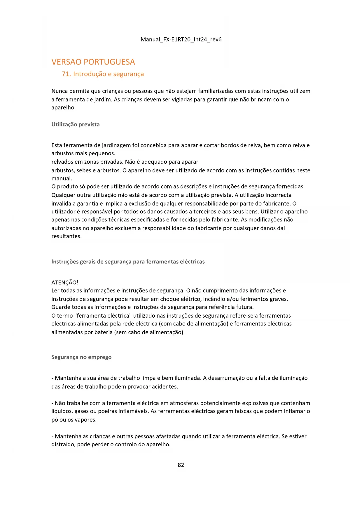 Antes da utilização - Familiarize-se com o aparador de relva e com as suas funções e comandos antes de começar a trabalhar. - Verificar se o aparelho apresenta sinais de desgaste ou danos antes da colocação em funcionamento e após um impacto. - Não utilizar um aparelho cujo interrutor esteja defeituoso e já não possa ser ligado ou desligado. - Verificar se todas as porcas, parafusos e parafusos estão bem apertados para garantir o funcionamento seguro do aparelho. - Nunca utilize um aparelho com peças danificadas ou em falta. Mande repará-las ou, se necessário, substituí-las por um especialista qualificado ou por uma oficina especializada. - Para reduzir o risco de ferimentos graves, nunca utilize arame ou fio reforçado com metal como fio de corte. - Ao trabalhar com ou no aparelho, use sempre sapatos resistentes, calças compridas e o equipamento de proteção individual adequado (óculos de proteção, proteção auditiva, luvas de trabalho com boa aderência, etc.). O uso de equipamento de proteção individual reduz o risco de ferimentos. - Não usar jóias ou roupas largas que possam ser apanhadas pela máquina de cortar relva. Manter os cabelos compridos afastados do fuso. - Verificar o local onde o aparelho está a ser utilizado e remover pedras e fios que possam ser apanhados pelo aparador de relva, para que não haja perigo para as pessoas. surge. - Retirar as ferramentas de ajuste ou as chaves inglesas antes de ligar o aparador. Uma ferramenta ou uma chave inglesa que se encontre numa parte rotativa do aparelho pode causar ferimentos. chumbo. Quando utilizado - Não utilizar o aparelho se houver pessoas (especialmente crianças) ou animais nas imediações. - Interromper o trabalho se se aperceber de que há pessoas (especialmente crianças) ou animais de estimação nas proximidades.Manual_FX-E1RT20_Int24_rev6