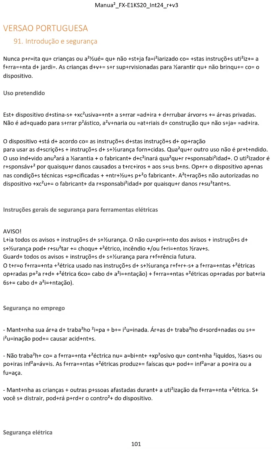 - Antes de iniciar o trabalho, familiarize-se com a motosserra e com as suas funções e comandos. - Verifique se o dispositivo apresenta sinais de desgaste ou danos antes do uso e após um impacto. - Não utilize um dispositivo cujo interruptor esteja com defeito e não possa mais ser ligado ou desligado. - Verifique se todas as porcas e parafusos estão apertados para garantir que o dispositivo funcione com segurança. - Nunca utilize um dispositivo com peças danificadas ou faltando. Mande repará-los ou, se necessário, substituí-los por um especialista qualificado ou uma oficina especializada. - Ao trabalhar com ou sobre o aparelho, use sempre calçado resistente, calças compridas e equipamento de proteção individual adequado (óculos de segurança, proteção auditiva, luvas de trabalho antiderrapantes, etc.). O uso de equipamento de proteção individual reduz o risco de lesões. - Não use joias ou roupas largas que possam ficar presas na motosserra. Mantenha os cabelos compridos afastados da unidade de corte. - Remova quaisquer ferramentas de ajuste ou chaves antes de ligar a motosserra. Uma ferramenta ou chave localizada numa parte móvel do dispositivo pode causar ferimentos. - Certifique-se de que a corrente esteja suficientemente lubrificada. Se a motosserra não estiver suficientemente lubrificada, provavelmente será danificada ou rachada. Quando implantado - Não utilize o aparelho se houver pessoas (especialmente crianças) ou animais nas imediações. - Pare de trabalhar se notar que há pessoas (especialmente crianças) ou animais de estimação por perto. - Mantenha sempre as mãos e os pés afastados das lâminas em movimento, principalmente ao ligar a motosserra. - Evite posturas anormais. Mantenha-o seguro Fique de pé e mantenha o equilíbrio em todos os momentos. Isto permite controlar melhor a motosserra em situações inesperadas e em áreas particularmente inclinadas. - Não trabalhe com a motosserra em ambientes explosivos que contenham líquidos, gases ou poeiras inflamáveis. O corta-sebes pode produzir faíscas que podem inflamar a poeira ou os fumos. - Tenha cuidado extra ao andar para trás. Existe o risco de tropeçar! - Caminhe apenas em ritmo de caminhada. - Ao interromper o trabalho, nunca deixe o aparelho sem vigilância e guarde-o em local seguro.Manual_FX-E1KS20_Int24_rev3