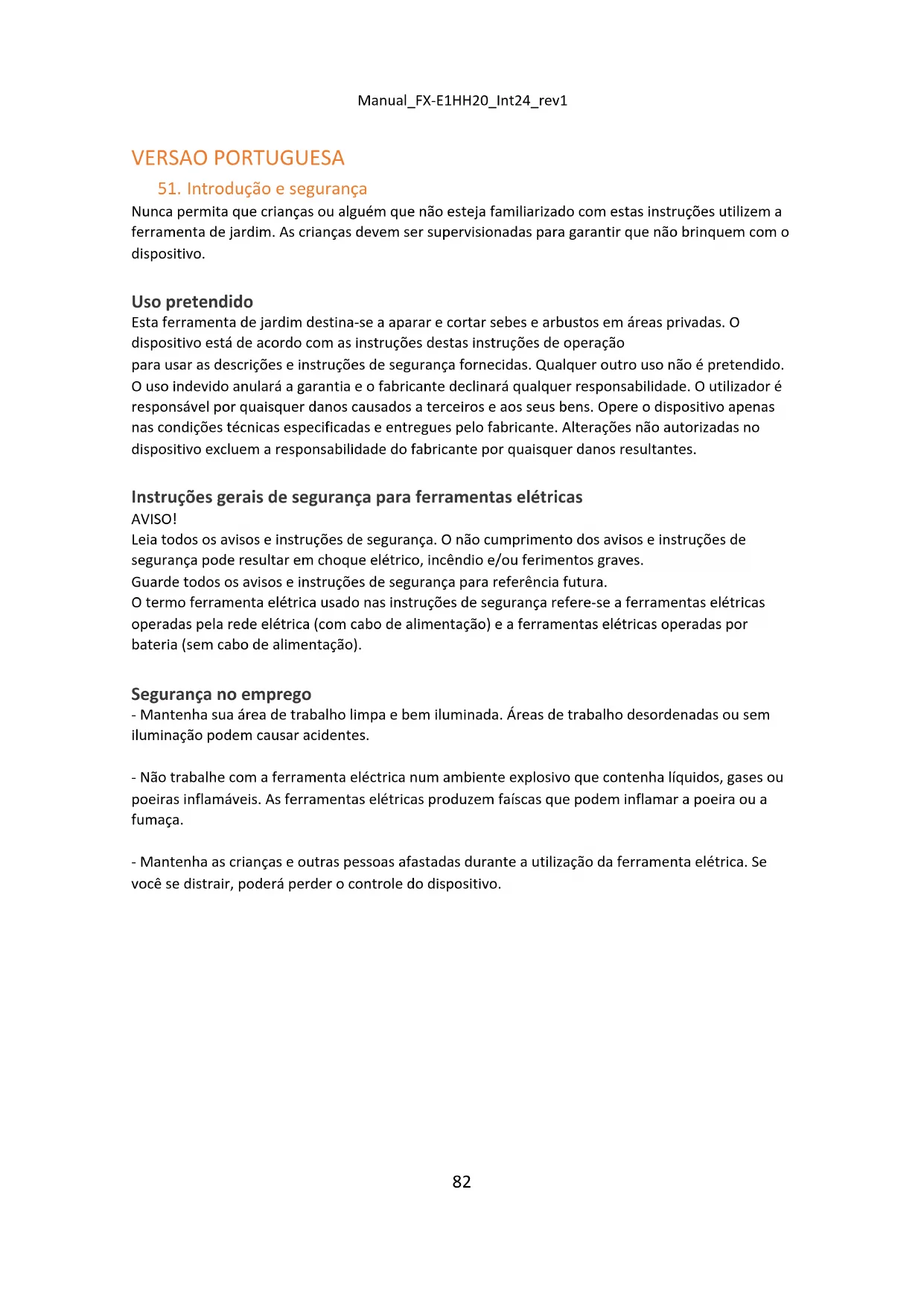 Nunca permita que crianças ou alguém que não esteja familiarizado com estas instruções utilizem a ferramenta de jardim. As crianças devem ser supervisionadas para garantir que não brinquem com o dispositivo. Uso pretendido Esta ferramenta de jardim destina-se a aparar e cortar sebes e arbustos em áreas privadas. O dispositivo está de acordo com as instruções destas instruções de operação para usar as descrições e instruções de segurança fornecidas. Qualquer outro uso não é pretendido. O uso indevido anulará a garantia e o fabricante declinará qualquer responsabilidade. O utilizador é responsável por quaisquer danos causados a terceiros e aos seus bens. Opere o dispositivo apenas nas condições técnicas especificadas e entregues pelo fabricante. Alterações não autorizadas no dispositivo excluem a responsabilidade do fabricante por quaisquer danos resultantes. Instruções gerais de segurança para ferramentas elétricas AVISO! Leia todos os avisos e instruções de segurança. O não cumprimento dos avisos e instruções de segurança pode resultar em choque elétrico, incêndio e/ou ferimentos graves. Guarde todos os avisos e instruções de segurança para referência futura. O termo ferramenta elétrica usado nas instruções de segurança refere-se a ferramentas elétricas operadas pela rede elétrica (com cabo de alimentação) e a ferramentas elétricas operadas por bateria (sem cabo de alimentação). Segurança no emprego - Mantenha sua área de trabalho limpa e bem iluminada. Áreas de trabalho desordenadas ou sem iluminação podem causar acidentes. - Não trabalhe com a ferramenta eléctrica num ambiente explosivo que contenha líquidos, gases ou poeiras inflamáveis. As ferramentas elétricas produzem faíscas que podem inflamar a poeira ou a fumaça. - Mantenha as crianças e outras pessoas afastadas durante a utilização da ferramenta elétrica. Se você se distrair, poderá perder o controle do dispositivo.Manual_FX-E1HH20_Int24_rev1