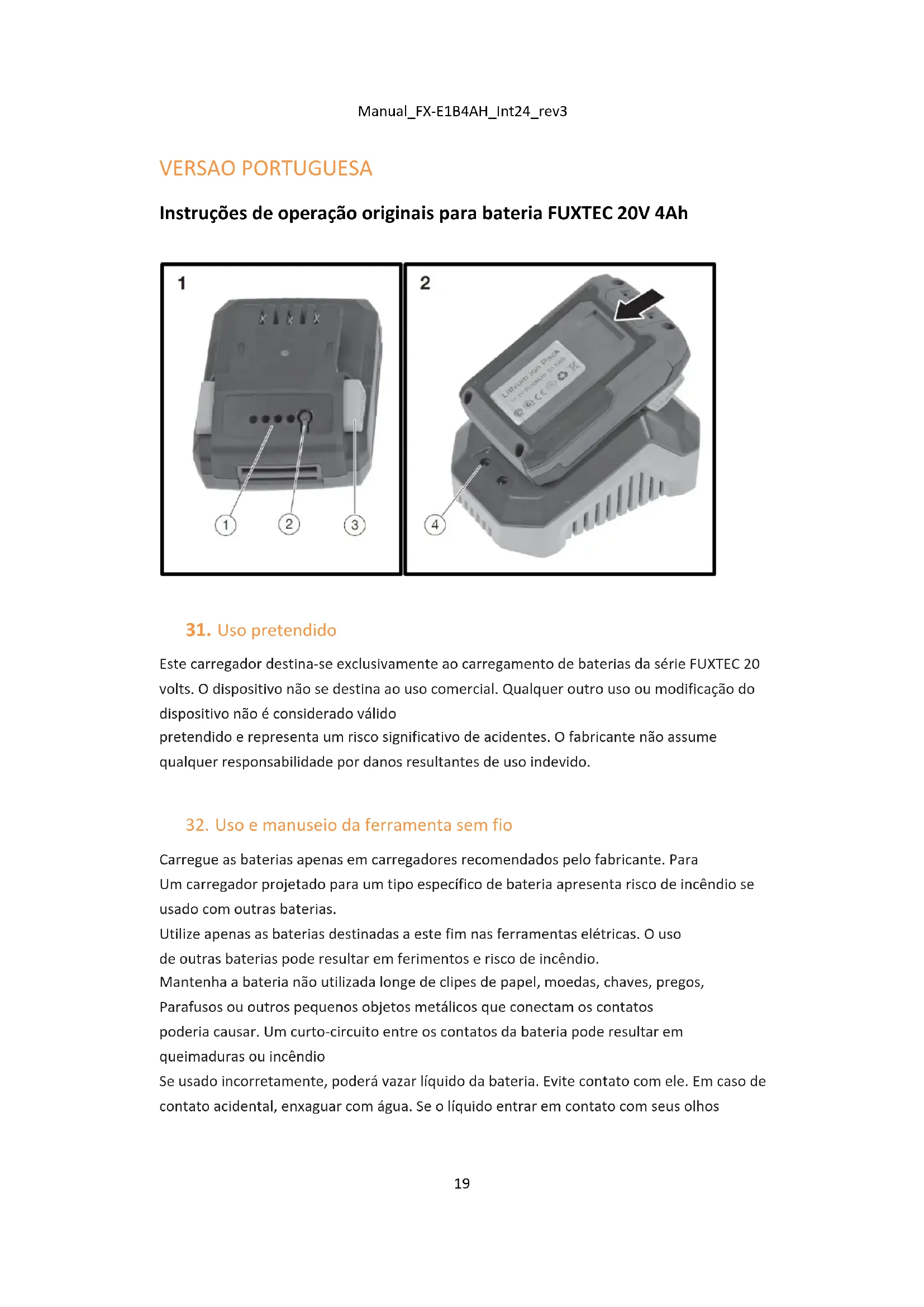 VERSAO PORTUGUESA Instruções de operação originais para bateria FUXTEC 20V 4Ah