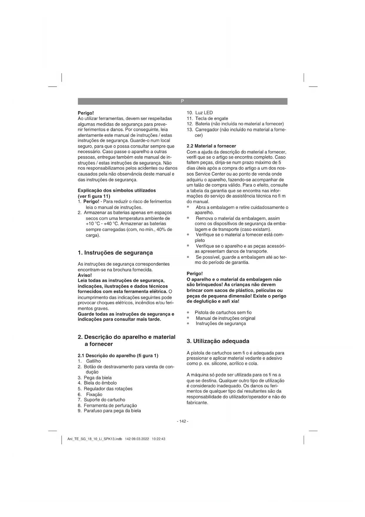 A pistola de cartuchos sem fi o é adequada para pressionar e aplicar material vedante e adesivo como p. ex. silicone, acrílico e cola. A máquina só pode ser utilizada para os fi ns a que se destina. Qualquer outro tipo de utilização é considerado inadequado. Os danos ou feri- mentos de qualquer tipo daí resultantes são da responsabilidade do utilizador/operador e não do fabricante. Anl_TE_SG_18_10_Li_SPK13.indb 142 09.03.2022 10:22:43P