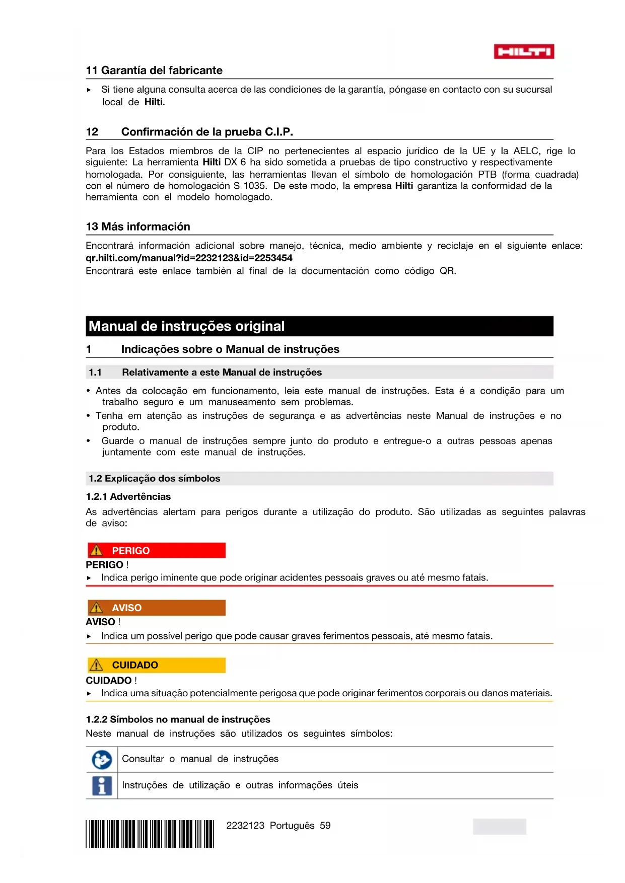 Avaria Causa possível Solução A fita de cartuchos não é transportada Fita de cartuchos danificada. ▶ Substituir a fita de cartuchos. Ferramenta de fixação está dema- siado suja. ▶ Limpar a ferramenta de fixação. ▶ Se necessário, mande verificar a ferramenta de fixação no Centro de Assistência Técnica Hilti. Ferramenta de fixação danificada. ▶ Contacte o Centro de Assistên- cia Técnica Hilti. Utilizada fita de cartuchos errada ▶ Utilize somente fitas de car- tuchos previstas para a ferra- menta de fixação. A fita de cartuchos é difícil de retirar. Sobreaquecimento da ferramenta de fixação. ▶ Deixar a ferramenta de fixação arrefecer sob constante super- visão. ▶ Em seguida, retirar cuidadosa- mente a fita de cartuchos da ferramenta de fixação. Acumulação de resíduos de com- bustão. ▶ Realizar o serviço da ferra- menta. ▶ Limpar a câmara de cartuchos. ▶ Inserir fita de cartuchos nova. Não é possível detonar o car- tucho Cartucho defeituoso. ▶ Avançar uma fita de cartuchos em um cartucho. Ferramenta de fixação suja. ▶ Realizar o serviço da ferra- menta. A fita de cartuchos derrete Ao aplicar, a ferramenta de fixação é pressionada durante demasiado tempo. ▶ Retirar a fita de cartuchos e substituir por uma nova. ▶ Pressionar durante menos tempo antes de accionar a ferramenta de fixação.78 Português 2232123 *2232123* Avaria Causa possível Solução A fita de cartuchos derrete Frequência de fixação demasiado elevada (ferramenta de fixação demasiado quente). ▶ Parar imediatamente o trabalho. ▶ Retirar a fita de cartuchos e deixar a ferramenta de fixação arrefecer. ▶ Não exceda a máxima frequên- cia de fixação recomendada (consultar o capítulo Caracterís- ticas técnicas). O cartucho solta-se da fita de cartuchos Frequência de fixação demasiado elevada (ferramenta de fixação demasiado quente). ▶ Parar imediatamente o trabalho. ▶ Retirar a fita de cartuchos e deixar a ferramenta de fixação arrefecer. ▶ Não exceda a máxima frequên- cia de fixação recomendada (consultar o capítulo Caracterís- ticas técnicas). 10 Reciclagem As ferramentas Hilti são, em grande parte, fabricadas com materiais recicláveis. Um pré-requisito para a reciclagem é que esses materiais sejam devidamente separados. Em muitos países, a Hilti aceita a sua ferramenta usada para reutilização. Para mais informações dirija-se ao Serviço de Clientes Hilti ou ao seu vendedor. 11 Garantia do fabricante ▶ Se tiver dúvidas em relação às condições de garantia, contacte o seu parceiro Hilti local. 12 Certificado de teste C.I.P. Para os estados membros da C.I.P. fora do espaço jurídico da UE e da EFTA, aplica-se o seguinte: Tanto o tipo como o sistema das ferramentas Hilti DX 6 foram testados. Como resultado, a ferramenta exibe a marca de aprovação da PTB, em forma de quadrado, com o número S 1035. Desta forma, a Hilti garante a conformidade com o tipo aprovado. 13 Mais informações Pode consultar informações mais pormenorizadas sobre Utilização, Tecnologia, Meio ambiente e Reciclagem na seguinte hiperligação: qr.hilti.com/manual?id=2232123&id=2253454 Também pode encontrar esta hiperligação no final da documentação sob a forma de código QR.Hilti = registered trademark of Hilti Corp., Schaan Pos. 3 | 20230908 *2232123*