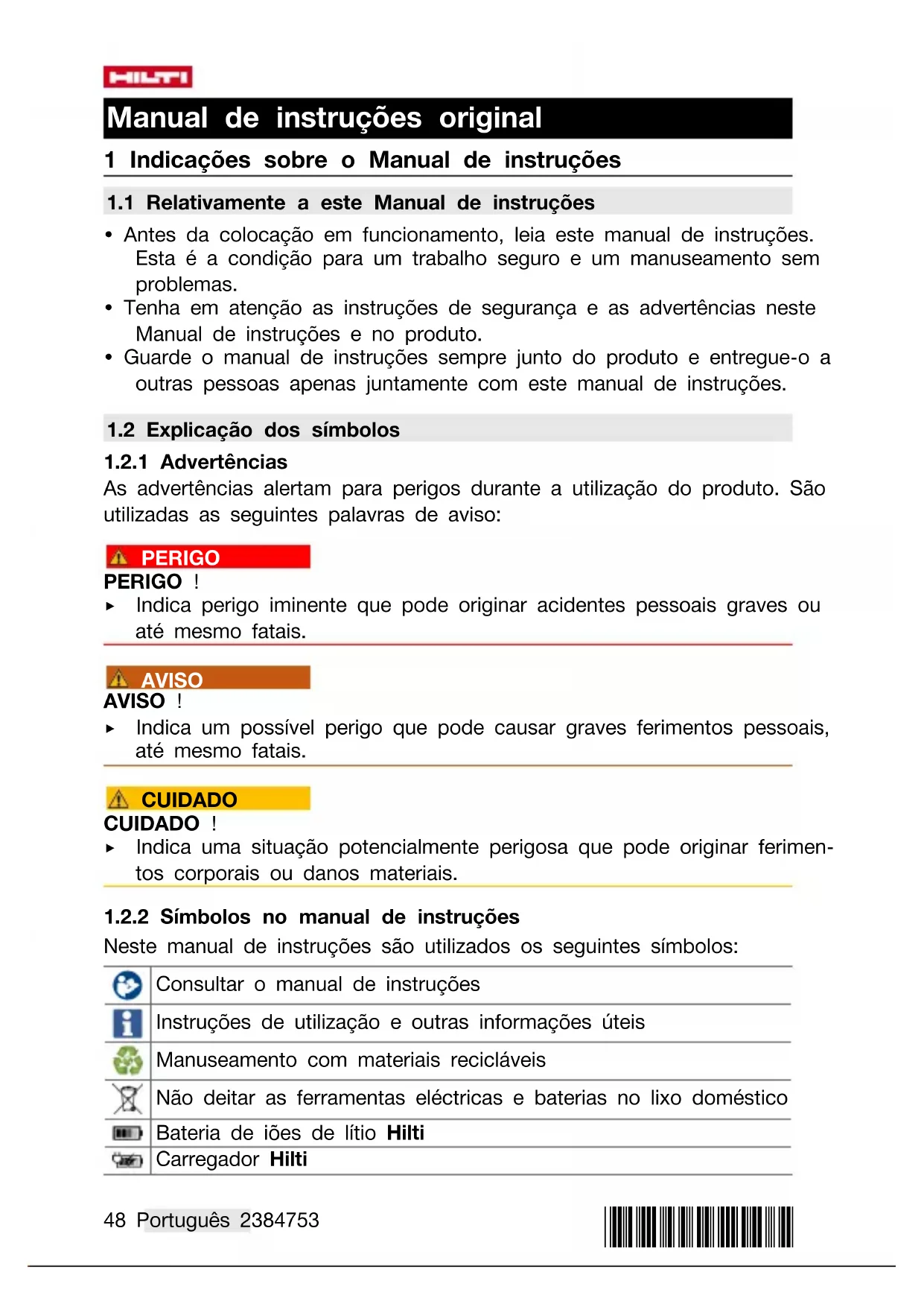 Neste manual de instruções são utilizados os seguintes símbolos: Consultar o manual de instruções Instruções de utilização e outras informações úteis Manuseamento com materiais recicláveis Não deitar as ferramentas eléctricas e baterias no lixo doméstico Bateria de iões de lítio Hilti Carregador Hilti*2384753* 2384753 Português 49