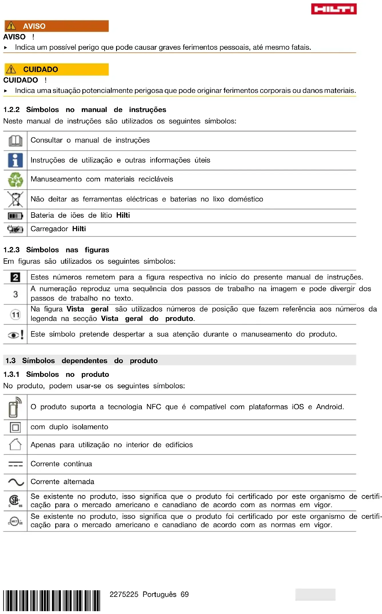 Neste manual de instruções são utilizados os seguintes símbolos: Consultar o manual de instruções Instruções de utilização e outras informações úteis Manuseamento com materiais recicláveis Não deitar as ferramentas eléctricas e baterias no lixo doméstico Bateria de iões de lítio Hilti Carregador Hilti