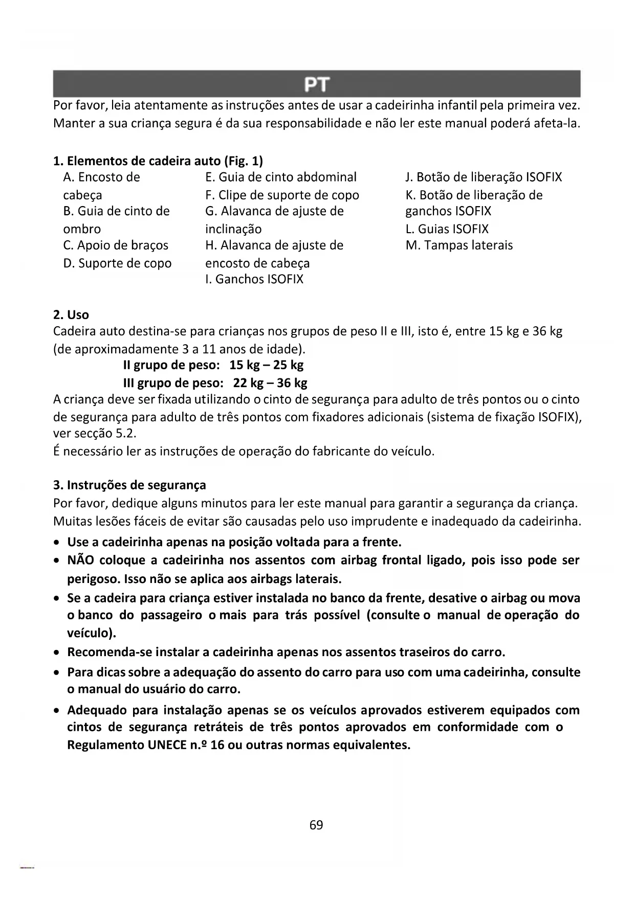 Cadeira auto destina-se para crianças nos grupos de peso II e III, isto é, entre 15 kg e 36 kg (de aproximadamente 3 a 11 anos de idade). II grupo de peso: 15 kg – 25 kg III grupo de peso: 22 kg – 36 kg A criança deve ser fixada utilizando o cinto de segurança para adulto de três pontos ou o cinto de segurança para adulto de três pontos com fixadores adicionais (sistema de fixação ISOFIX), ver secção 5.2. É necessário ler as instruções de operação do fabricante do veículo.