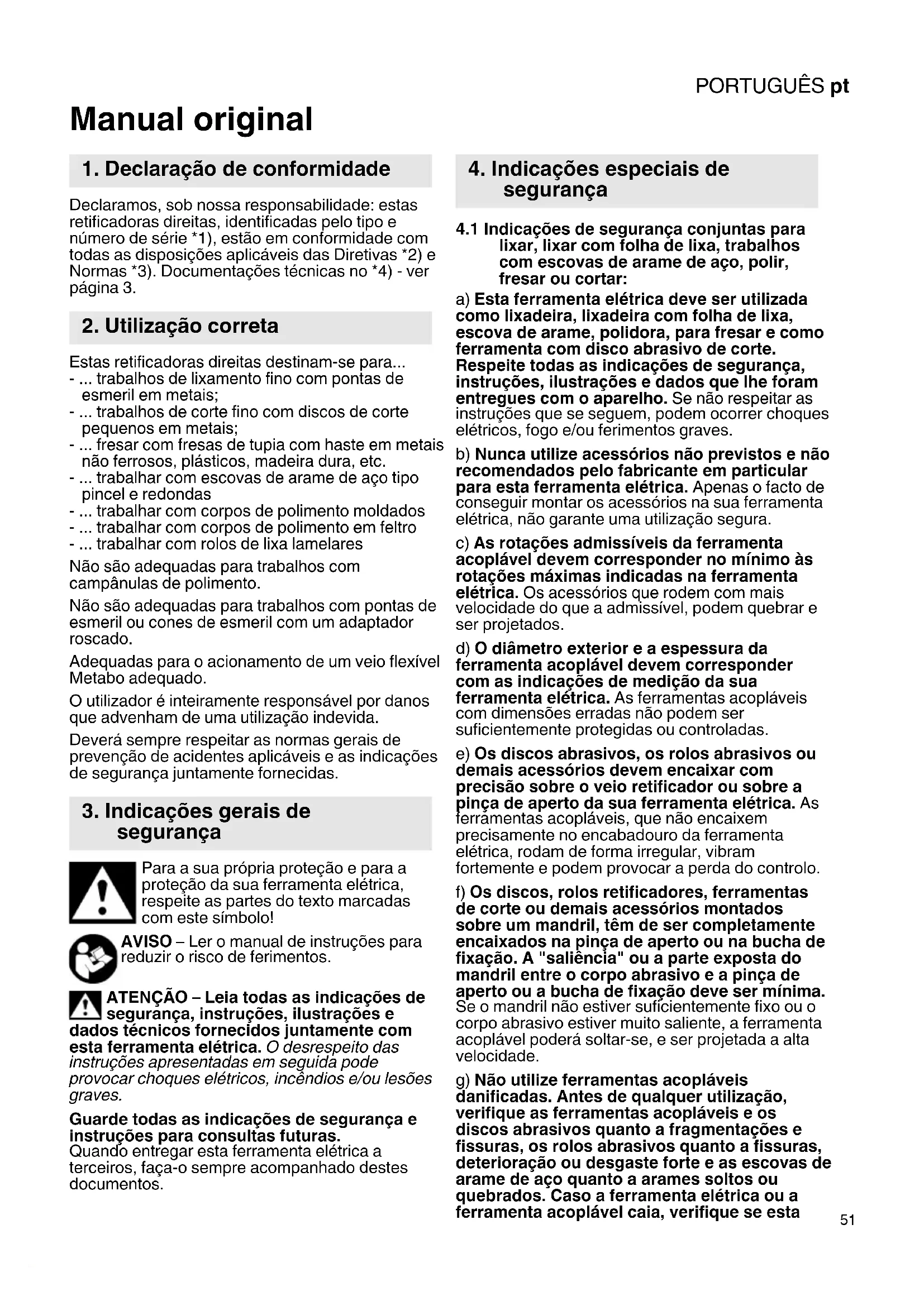 Manual original Declaramos, sob nossa responsabilidade: estas retificadoras direitas, identificadas pelo tipo e número de série *1), estão em conformidade com todas as disposições aplicáveis das Diretivas *2) e Normas *3). Documentações técnicas no *4) - ver página 3. Estas retificadoras direitas destinam-se para... - ... trabalhos de lixamento fino com pontas de esmeril em metais; - ... trabalhos de corte fino com discos de corte pequenos em metais; - ... fresar com fresas de tupia com haste em metais não ferrosos, plásticos, madeira dura, etc. - ... trabalhar com escovas de arame de aço tipo pincel e redondas - ... trabalhar com corpos de polimento moldados - ... trabalhar com corpos de polimento em feltro - ... trabalhar com rolos de lixa lamelares Não são adequadas para trabalhos com campânulas de polimento. Não são adequadas para trabalhos com pontas de esmeril ou cones de esmeril com um adaptador roscado. Adequadas para o acionamento de um veio flexível Metabo adequado. O utilizador é inteiramente responsável por danos que advenham de uma utilização indevida. Deverá sempre respeitar as normas gerais de prevenção de acidentes aplicáveis e as indicações de segurança juntamente fornecidas. Para a sua própria proteção e para a proteção da sua ferramenta elétrica, respeite as partes do texto marcadas com este símbolo! AVISO – Ler o manual de instruções para reduzir o risco de ferimentos. ATENÇÃO – Leia todas as indicações de segurança, instruções, ilustrações e dados técnicos fornecidos juntamente com esta ferramenta elétrica. O desrespeito das instruções apresentadas em seguida pode provocar choques elétricos, incêndios e/ou lesões graves. Guarde todas as indicações de segurança e instruções para consultas futuras. Quando entregar esta ferramenta elétrica a terceiros, faça-o sempre acompanhado destes documentos.