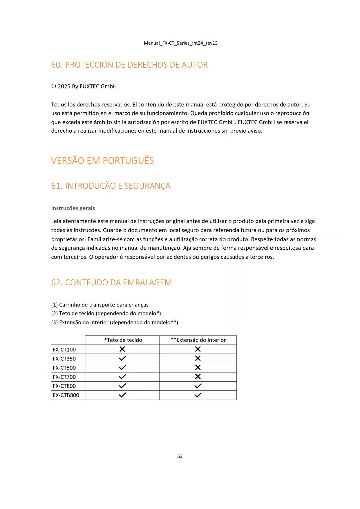 Tapetes curtos e longos (disponíveis para todos os modelos CT500 e CT700) Cobertura de chuva transparente (disponível para CT500, CT700 + CT800) Proteção solar e rede mosquiteira (disponível para os modelos CT500, CT700 + CT800) Cintos de segurança em cores diferentes (disponível para todos os modelos) Sacos térmicos em diferentes cores (disponíveis para todos os modelos)Manual_FX-CT_Series_Int24_rev13
