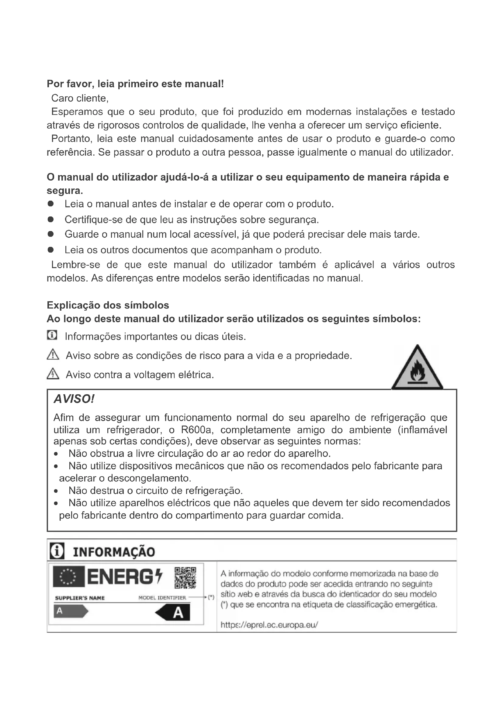 - Es posible que algún alimento toque el techo del cajón. >>>Cambie la distribución de los alimentos en el cajón.Por favor, leia primeiro este manual! Caro cliente, Esperamos que o seu produto, que foi produzido em modernas instalações e testado através de rigorosos controlos de qualidade, lhe venha a oferecer um serviço eficiente. Portanto, leia este manual cuidadosamente antes de usar o produto e guarde-o como referência. Se passar o produto a outra pessoa, passe igualmente o manual do utilizador. O manual do utilizador ajudá-lo-á a utilizar o seu equipamento de maneira rápida e segura. z Leia o manual antes de instalar e de operar com o produto. z Certifique-se de que leu as instruções sobre segurança. z Guarde o manual num local acessível, já que poderá precisar dele mais tarde. z Leia os outros documentos que acompanham o produto. Lembre-se de que este manual do utilizador também é aplicável a vários outros modelos. As diferenças entre modelos serão identificadas no manual. Explicação dos símbolos Ao longo deste manual do utilizador serão utilizados os seguintes símbolos: Informações importantes ou dicas úteis. Aviso sobre as condições de risco para a vida e a propriedade. Aviso contra a voltagem elétrica. AVISO! Afim de assegurar um funcionamento normal do seu aparelho de refrigeração que utiliza um refrigerador, o R600a, completamente amigo do ambiente (inflamável apenas sob certas condições), deve observar as seguintes normas: x Não obstrua a livre circulação do ar ao redor do aparelho. x Não utilize dispositivos mecânicos que não os recomendados pelo fabricante para acelerar o descongelamento. x Não destrua o circuito de refrigeração. x Não utilize aparelhos eléctricos que não aqueles que devem ter sido recomendados pelo fabricante dentro do compartimento para guardar comida.1 O seu frigorífico 3 2 Avisos importantes de segurança 5 Uso pretendido...................................... 4 Segurança geral..................................... 5 Para produtos com um dispensador de água........................................................ 6 Segurança com crianças........................ 6 Conformidade com a Diretiva WEEE e Eliminação do Produto………………….. 6 Informação sobre a embalagem............. 7 Aviso HCA............................................... 7 O que se pode fazer para economizar energia…………………………………….. 7 3 Instalação 8 Pontos a ter em atenção ao recolocar o frigorífico................................................ 8 Antes de colocar o frigorífico em funcionamento,....................................... 8 Ligação elétrica....................................... 8 Eliminação da embalagem...................... 8 Eliminação do seu frigorífico velho......... 9 Colocação e instalação........................... 9 Substituir a lâmpada de iluminação ....... 9 Ajuste dos pés......................................... 9 ÍNDİCE 2 PT 4 Preparação 10 5 Utilização do seu frigorífico 11 Botão de ajuste do termóstato ……...11 Sistema de arrefecimento duplo:.......11 Inverter as portas …………………… 12 Congelar a limentos frescos...............13 Recomendações para a preservação de alimentos congelados...................14 Descongelação.......................