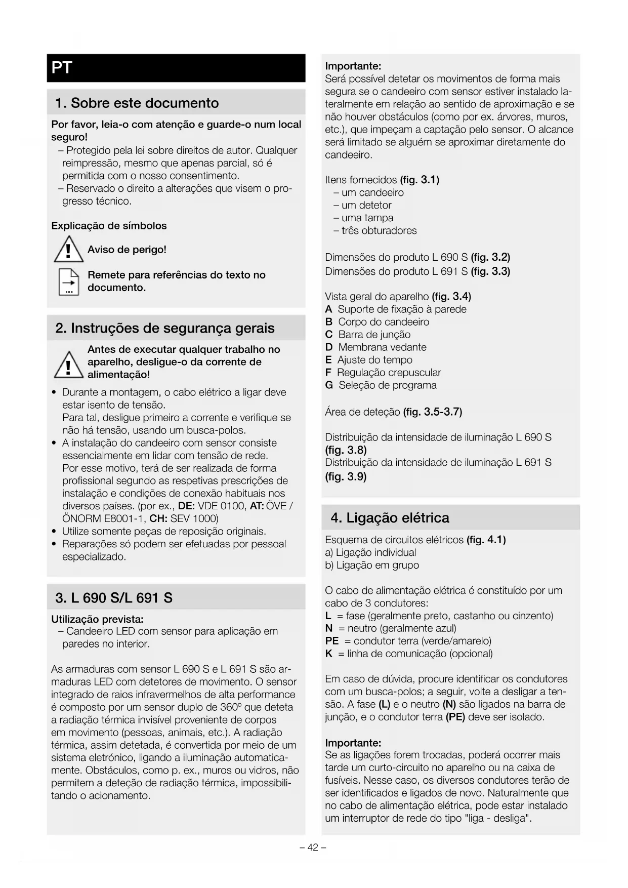 Utilização prevista: – Candeeiro LED com sensor para aplicação em paredes no interior. As armaduras com sensor L690 S e L691 S são ar- maduras LED com detetores de movimento. O sensor integrado de raios infravermelhos de alta performance é composto por um sensor duplo de 360º que deteta a radiação térmica invisível proveniente de corpos em movimento (pessoas, animais, etc.). A radiação térmica, assim detetada, é convertida por meio de um sistema eletrónico, ligando a iluminação automatica- mente. Obstáculos, como p. ex., muros ou vidros, não permitem a deteção de radiação térmica, impossibili- tando o acionamento. Importante: Será possível detetar os movimentos de forma mais segura se o candeeiro com sensor estiver instalado la- teralmente em relação ao sentido de aproximação e se não houver obstáculos (como por ex. árvores, muros, etc.), que impeçam a captação pelo sensor. O alcance será limitado se alguém se aproximar diretamente do candeeiro. Itens fornecidos (fig.3.1) – um candeeiro – um detetor – uma tampa – três obturadores Dimensões do produto L690 S (fig.3.2) Dimensões do produto L691 S (fig.3.3) Vista geral do aparelho (fig.3.4) A Suporte de fixação à parede B Corpo do candeeiro C Barra de junção D Membrana vedante E Ajuste do tempo F Regulação crepuscular G Seleção de programa Área de deteção (fig.3.5-3.7) Distribuição da intensidade de iluminação L690S (fig.3.8) Distribuição da intensidade de iluminação L691S (fig.3.9)