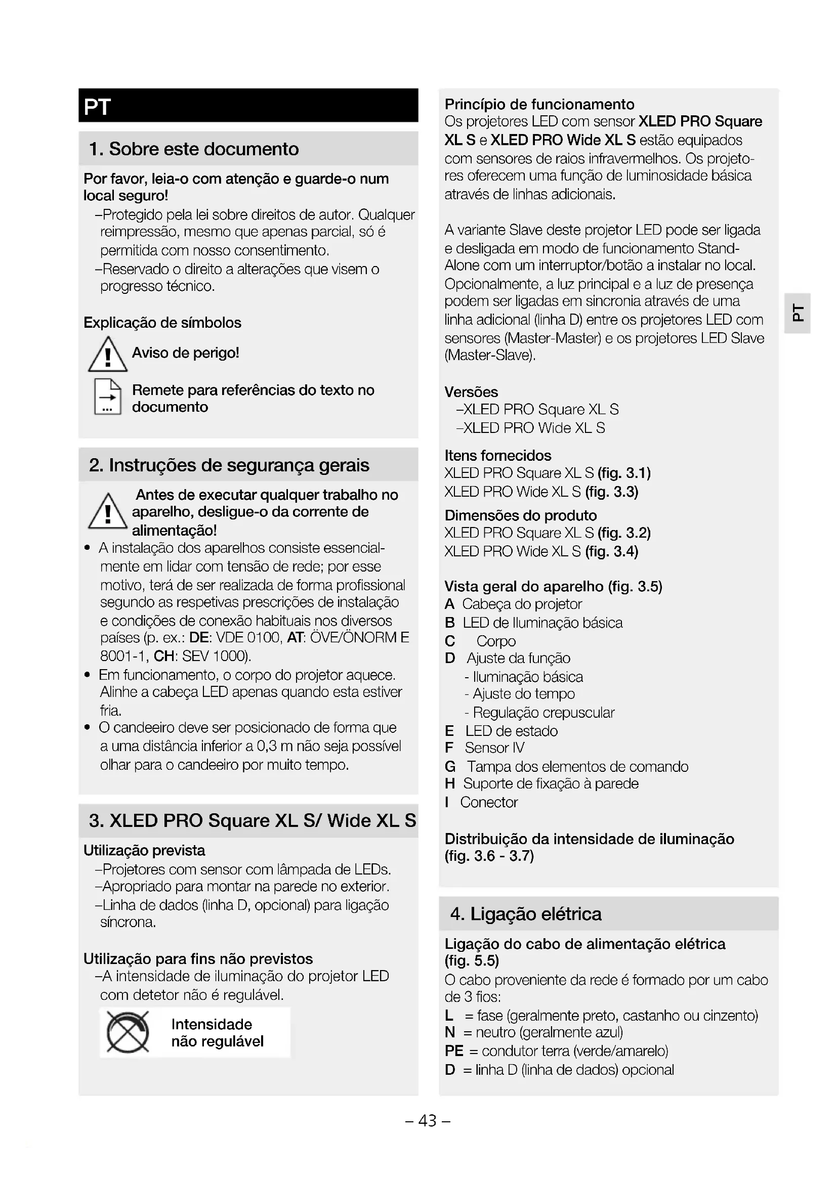 Utilização prevista – Projetores com sensor com lâmpada de LEDs. – Apropriado para montar na parede no exterior. – Linha de dados (linha D, opcional) para ligação síncrona. Utilização para fins não previstos – A intensidade de iluminação do projetor LED com detetor não é regulável. Intensidade não regulável Princípio de funcionamento Os projetores LED com sensor XLEDPROSquare XLS e XLEDPROWideXLS estão equipados com sensores de raios infravermelhos. Os projeto- res oferecem uma função de luminosidade básica através de linhas adicionais. A variante Slave deste projetor LED pode ser ligada e desligada em modo de funcionamento Stand- Alone com um interruptor/botão a instalar no local. Opcionalmente, a luz principal e a luz de presença podem ser ligadas em sincronia através de uma linha adicional (linha D) entre os projetores LED com sensores (Master-Master) e os projetores LED Slave (Master-Slave). Versões – XLEDPROSquareXLS – XLEDPROWideXLS Itens fornecidos XLEDPROSquareXLS (fig. 3.1) XLEDPROWideXLS (fig. 3.3) Dimensões do produto XLEDPROSquareXLS (fig. 3.2) XLEDPROWideXLS (fig. 3.4) Vista geral do aparelho (fig. 3.5) A Cabeça do projetor B LED de Iluminação básica C Corpo D Ajuste da função - Iluminação básica - Ajuste do tempo - Regulação crepuscular E LED de estado F Sensor IV G Tampa dos elementos de comando H Suporte de fixação à parede I Conector Distribuição da intensidade de iluminação (fig. 3.6 - 3.7)
