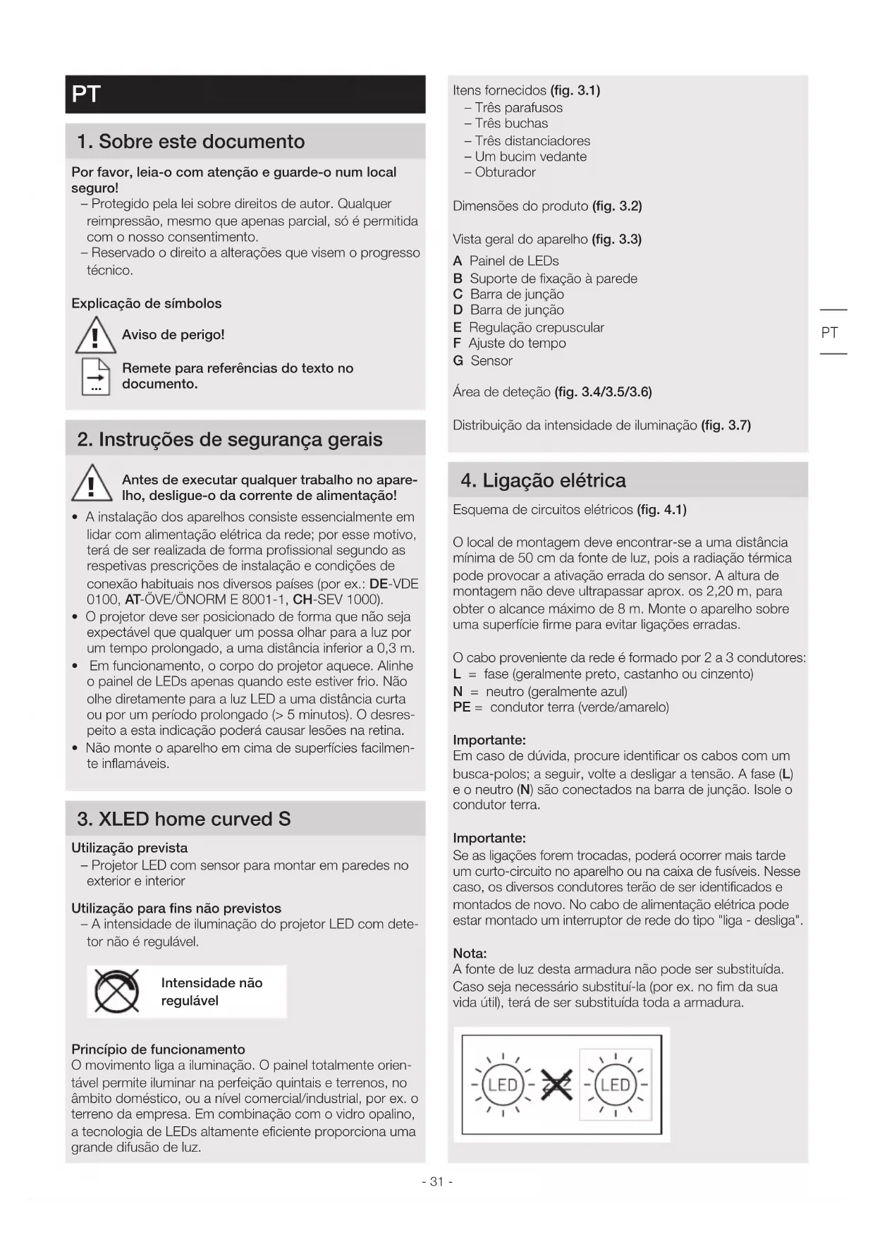 Aviso de perigo! Remete para referências do texto no documento 2 Instruções de segurança gerais Antes de executar qualquer trabalho no apare-lho, desligue-o da corrente de alimentação! • A instalação dos aparelhos consiste essencialmente em lidar com alimentação elétrica da rede; por esse motivo, terá de ser realizada de forma profissional segundo as respetivas prescrições de instalação e condições de conexão habituais nos diversos países (porex.: DE-VDE 0100, AT-ÖVE/ÖNORM E 8001-1, CH-SEV 1000).• O projetor deve ser posicionado de forma que não seja expectável que qualquer um possa olhar para a luz por um tempo prolongado, a uma distância inferior a 0,3 m.• Em funcionamento, o corpo do projetor aquece. Alinhe o painel de LEDs apenas quando este estiver frio. Não olhe diretamente para a luz LED a uma distância curta ou por um período prolongado (> 5minutos). O desres-peito a esta indicação poderá causar lesões na retina.• Não monte o aparelho em cima de superfícies facilmen-te inflamáveis. 3 XLED home curved S Utilização prevista – Projetor LED com sensor para montar em paredes no exterior e interiorUtilização para fins não previstos – A intensidade de iluminação do projetor LED com dete-tor não é regulável.Intensidade não regulávelPrincípio de funcionamentoO movimento liga a iluminação. O painel totalmente orien-tável permite iluminar na perfeição quintais e terrenos, no âmbito doméstico, ou a nível comercial/industrial, por ex. o terreno da empresa. Em combinação com o vidro opalino, a tecnologia de LEDs altamente eficiente proporciona uma grande difusão de luz.