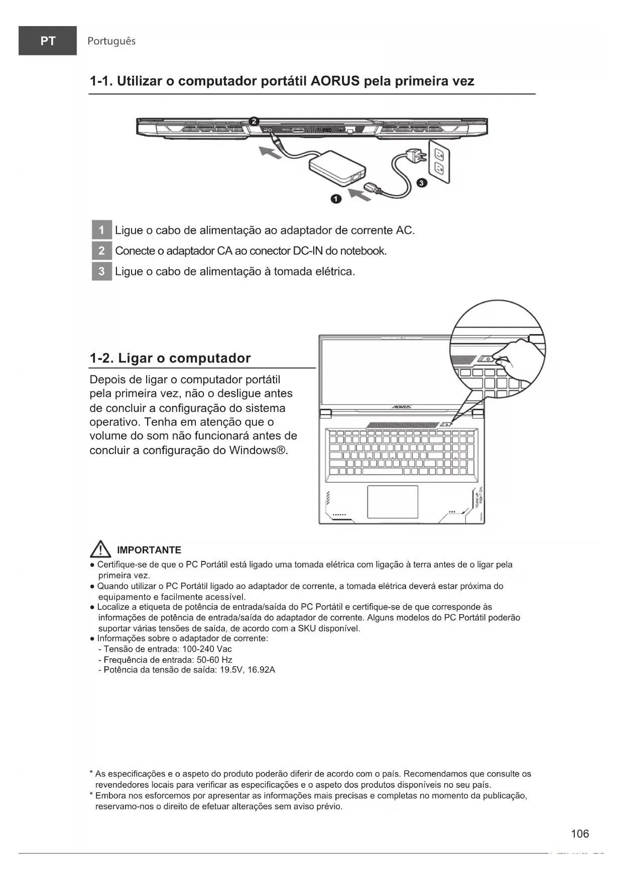 Ligue o cabo de alimentação à tomada elétrica. 1-2. Ligar o computador Depois de ligar o computador portátil pela primeira vez, não o desligue antes de concluir a conguração do sistema operativo. Tenha em atenção que o volume do som não funcionará antes de concluir a conguração do Windows®. IMPORTANTE● Certifique-se de que o PC Portátil está ligado uma tomada elétrica com ligação à terra antes de o ligar pela primeira vez.● Quando utilizar o PC Portátil ligado ao adaptador de corrente, a tomada elétrica deverá estar próxima do equipamento e facilmente acessível.● Localize a etiqueta de potência de entrada/saída do PC Portátil e certifique-se de que corresponde às informações de potência de entrada/saída do adaptador de corrente. Alguns modelos do PC Portátil poderão suportar várias tensões de saída, de acordo com a SKU disponível.● Informações sobre o adaptador de corrente: - Tensão de entrada: 100-240 Vac - Frequência de entrada: 50-60 Hz - Potência da tensão de saída: 19.5V, 16.92A* As especicações e o aspeto do produto poderão diferir de acordo com o país. Recomendamos que consulte os revendedores locais para vericar as especicações e o aspeto dos produtos disponíveis no seu país. * Embora nos esforcemos por apresentar as informações mais precisas e completas no momento da publicação, reservamo-nos o direito de efetuar alterações sem aviso prévio.Português