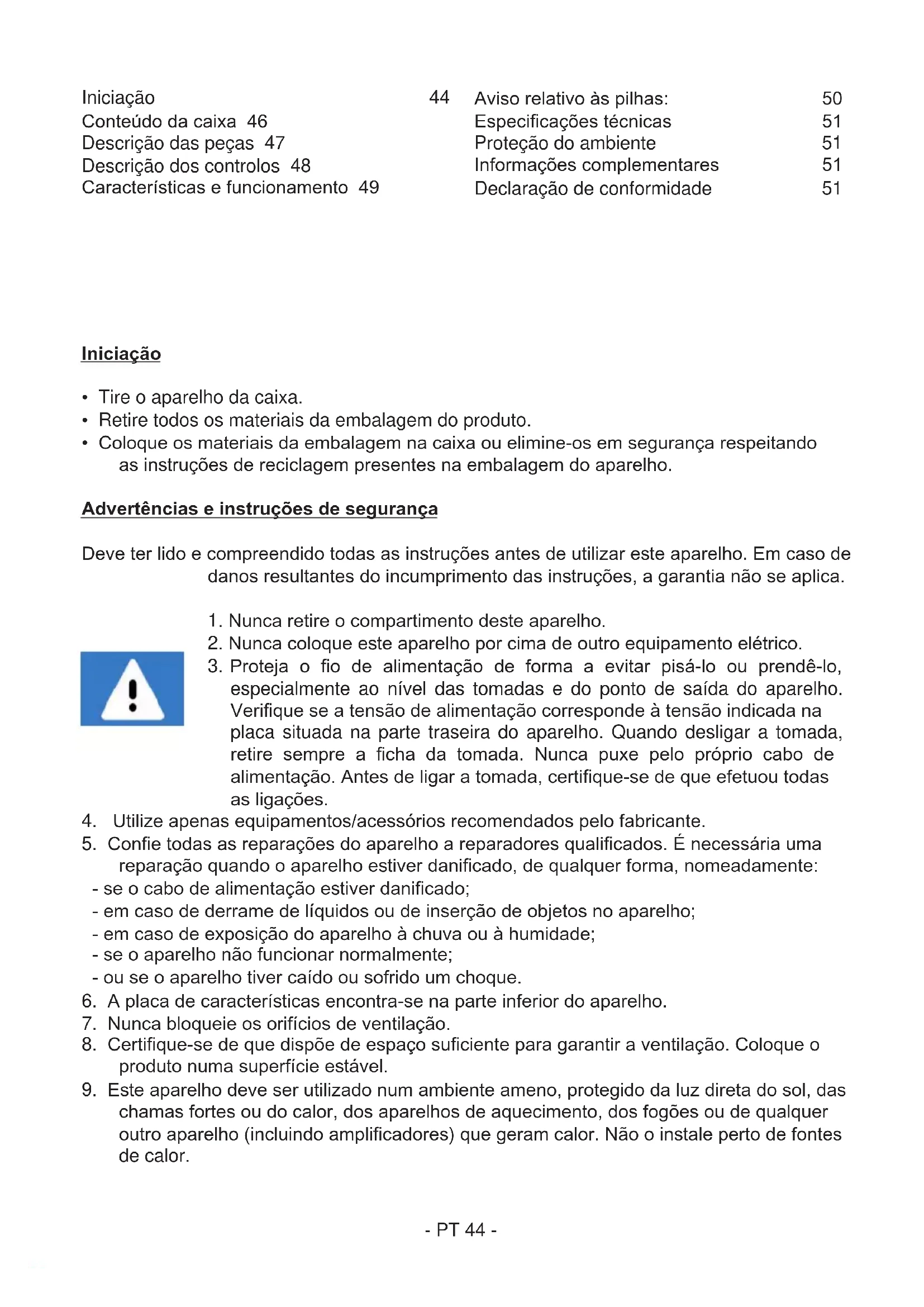 chamas fortes ou do calor, dos aparelhos de aquecimento, dos fogões ou de qualquer outro aparelho (incluindo amplicadores) que geram calor. Não o inale perto de fontes de calor. Iniciação 44 Conteúdo da caixa 46 Descrição das peças 47 Descrição dos controlos 48 Características e funcionamento 49 Aviso relativo às pilhas: 50 Especicações técnicas 51 Proteção do ambiente 51 Informações complementares 51 Declaração de conformidade 51- PT 45 -