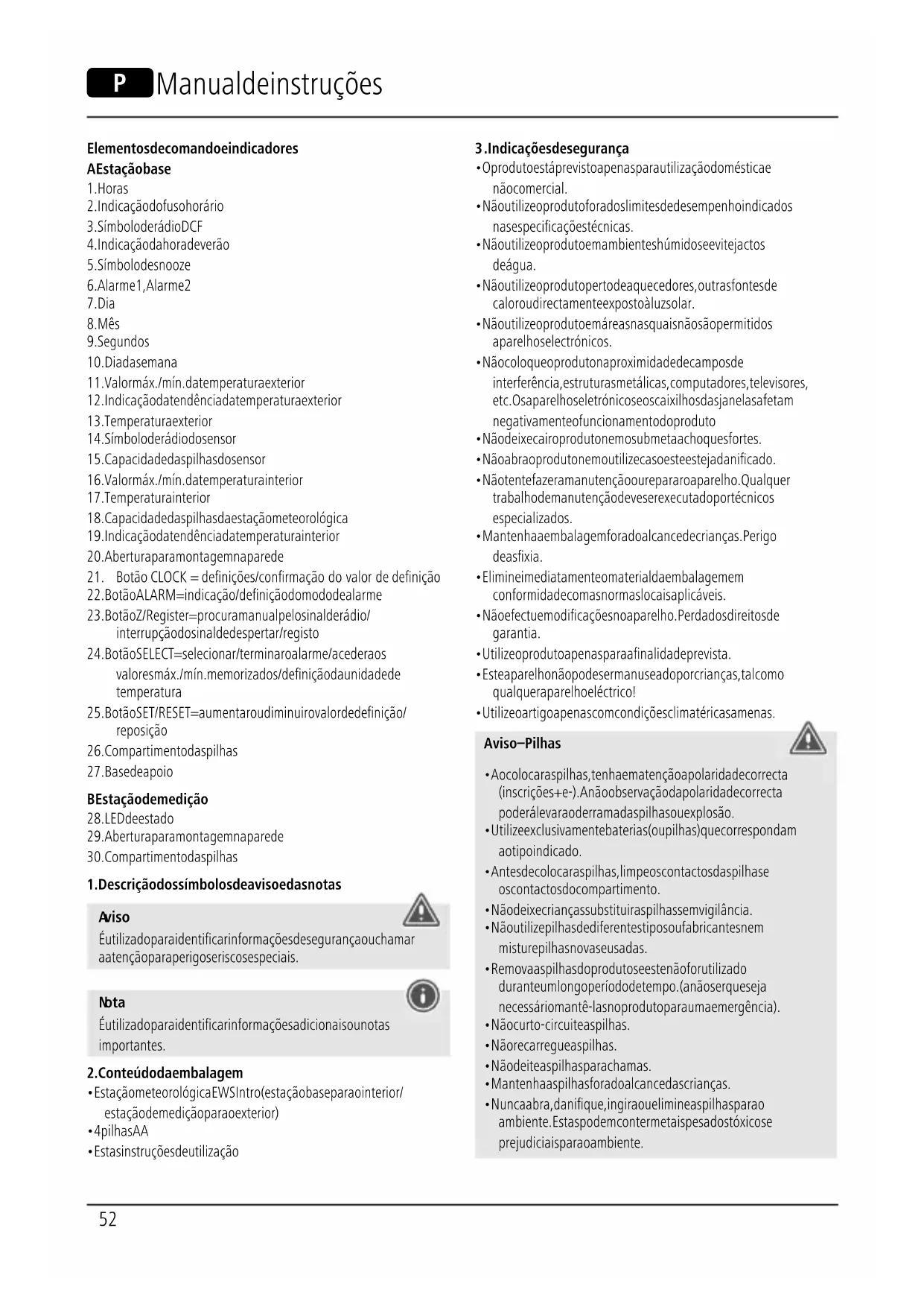 - Nunca abra, danique, ingira ou elimine as pilhas para o ambiente. Estas podem conter metais pesados tóxicos e prejudiciais para o ambiente. O Manual de instruções53 Aviso – Pilhas