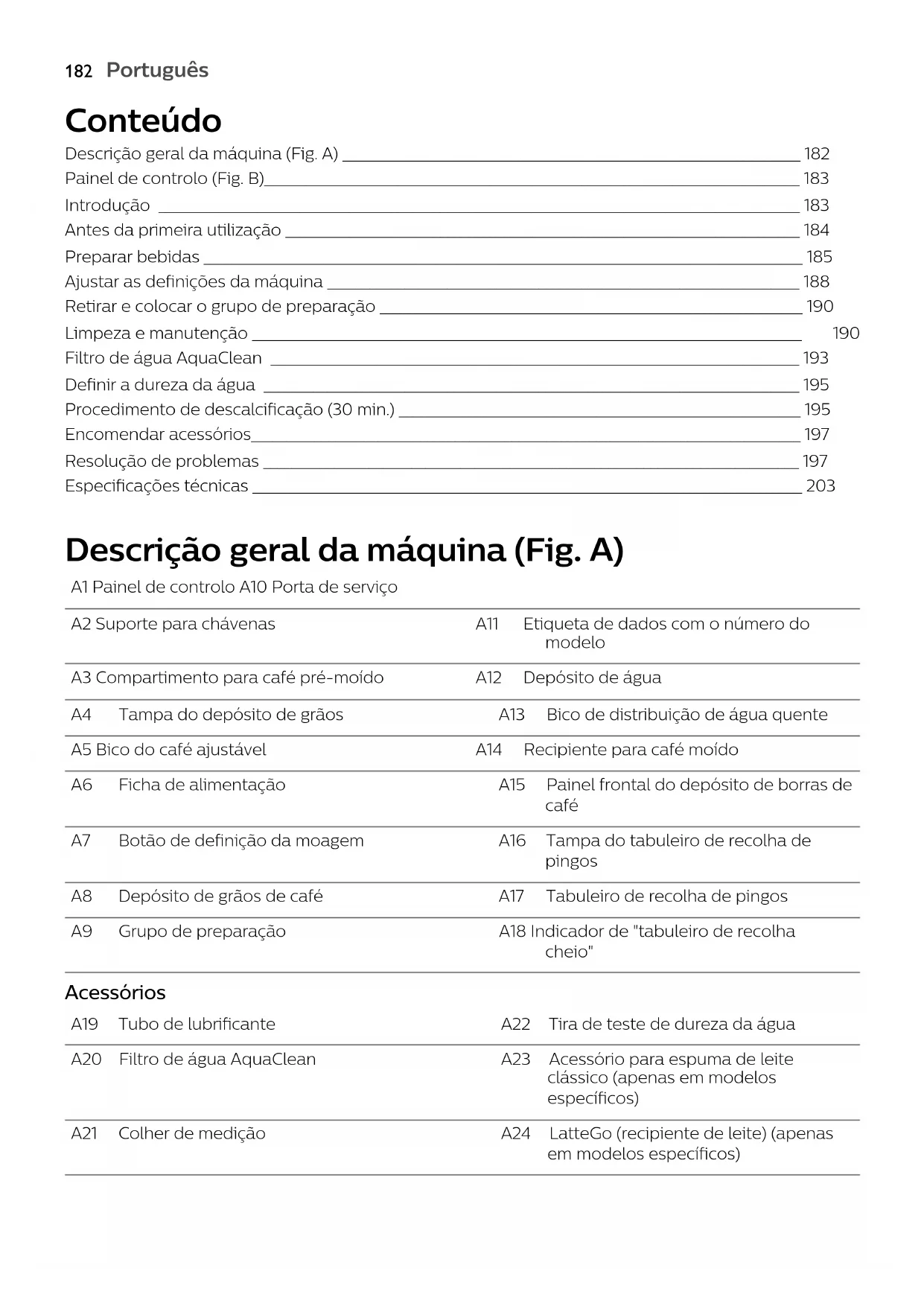 Norsk Norsk Tekniske spesifikasjoner Produsenten forbeholder seg retten til å oppdatere de tekniske spesifikasjonene for produktet. Alle de forhåndsinnstilte mengdene er omtrentlige. Beskrivelse VerdiPortuguês Conteúdo Descrição geral da máquina (Fig. A) _________________________________________________________________ 182 Painel de controlo (Fig. B)____________________________________________________________________________ 183 Introdução ___________________________________________________________________________________________ 183 Antes da primeira utilização _________________________________________________________________________ 184 Preparar bebidas _____________________________________________________________________________________ 185 Ajustar as definições da máquina ___________________________________________________________________ 188 Retirar e colocar o grupo de preparação ____________________________________________________________ 190 Limpeza e manutenção ______________________________________________________________________________ 190 Filtro de água AquaClean ___________________________________________________________________________ 193 Definir a dureza da água ____________________________________________________________________________ 195 Procedimento de descalcificação (30 min.) _________________________________________________________ 195 Encomendar acessórios______________________________________________________________________________ 197 Resolução de problemas ____________________________________________________________________________ 197 Especificações técnicas ______________________________________________________________________________ 203 Descrição geral da máquina (Fig. A) A1 Painel de controlo A10 Porta de serviço A2 Suporte para chávenas A11 Etiqueta de dados com o número do modelo A3 Compartimento para café pré-moído A12 Depósito de água A4 Tampa do depósito de grãos A13 Bico de distribuição de água quente A5 Bico do café ajustável A14 Recipiente para café moído A6 Ficha de alimentação A15 Painel frontal do depósito de borras de café A7 Botão de definição da moagem A16 Tampa do tabuleiro de recolha de pingos A8 Depósito de grãos de café A17 Tabuleiro de recolha de pingos A9 Grupo de preparação A18 Indicador de "tabuleiro de recolha cheio" Acessórios A19 Tubo de lubrificante A22 Tira de teste de dureza da água A20 Filtro de água AquaClean A23 Acessório para espuma de leite clássico (apenas em modelos específicos) A21 Colher de medição A24 LatteGo (recipiente de leite) (apenas em modelos específicos)